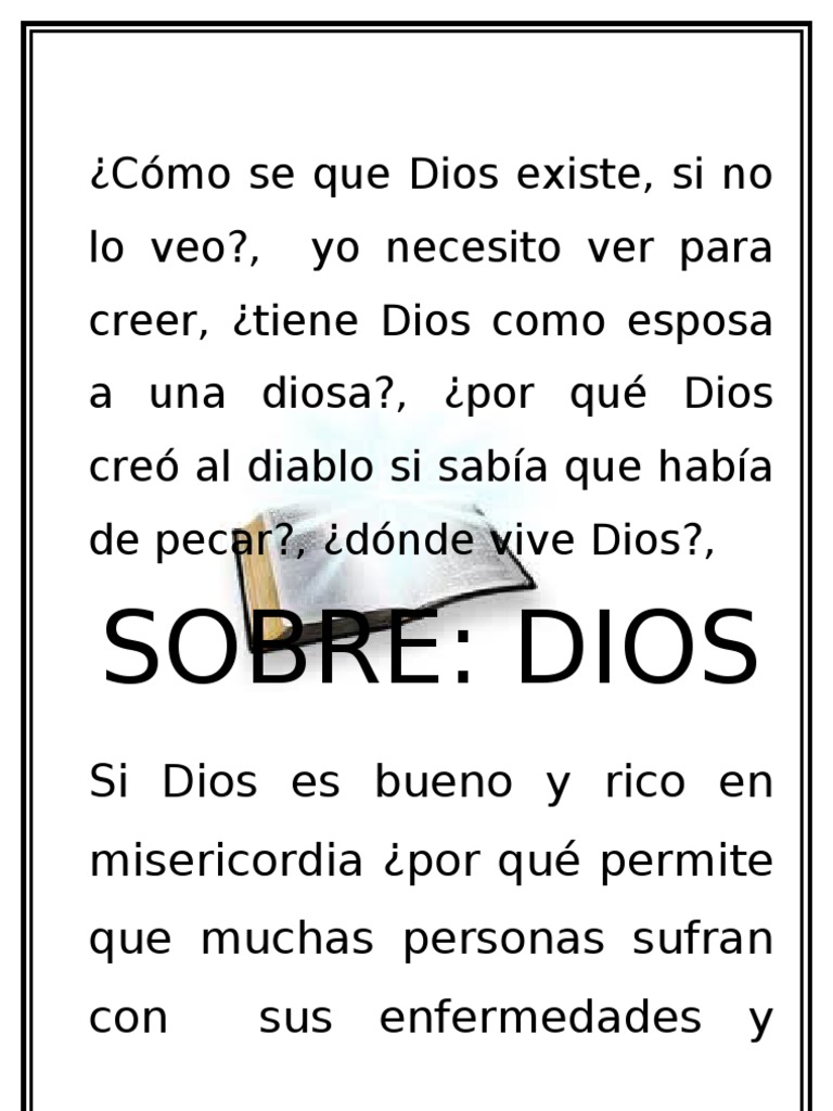 INTRODUCION. La mayor parte de los inconversos preguntaran con el deseo de evangelizarlos y confundirlos o aran pretextos diciendo que si les contestas algunas preguntas entonces si se entregaran al Seor; aunque en el fondo sabemos que son escusas que ellos utilizan con el fin de no entregar sus vidas a Cristo. En el presente libro se contestaran brevemente las preguntas ms comunes (cmo se que Dios existe, si no lo veo?, yo necesito ver para creer, tiene Dios como esposa a una diosa) a fin que el miembro sepa como contestar a los inconversos, ya que El Dios de la Biblia difiere de los dioses falsos en su personalidad nica. Dios existe, l es nico ser personal y consiente, Creador del universo y causante de todas las cosas, Creador del hombre y de la sabidura, el amante redentor del gnero humano. El concepto de Dios est obviamente en la mente del hombre, pero el hombre no puede conocer acerca de Dios el Creador hasta que estudia su Palabra y sus Obras. El conocimiento intuitivo de Dios es dado libremente, pero el conocimiento ms grande de Dios viene como resultado del estudio, la reflexin, la oracin y por un proceso de aprendizaje de la Biblia. La revelacin divina que encontramos en la Biblia nos remonta a un punto que ni la ciencia, ni la filosofa puede alcanzar. La revelacin especial de Dios (la Biblia) es el nico medio por el cual podemos obtener un verdadero conocimiento de la Persona de Dios. Hoy ms que nunca es esencial conocer como es Dios. SOBRE: futuras. 1) CMO SE QUE DIOS EXISTE, SI NO LO VEO? > Dios es un ser Espiritual, y no material. Si Dios fuese material nuestros ojos lo veran y nuestras manos lo tocaran, o nuestros odos lo escucharan; y si fuera humano entonces ya no sera Dios, pues todo lo que se ve y se toca no es eterno, sino temporal, pero si a DIOS no se le ve entonces es porque es eterno. II CORITIOS.4:18.- A nosotros no nos interesa lo que se puede ver, porque lo que se puede ver, solo dura poco tiempo. En cambio, lo que no se puede ver, dura para siempre. Sabemos que Dios es Espritu. DIOS Dios es todopoderoso y omnisciente; y su perfecto conocimiento se extiende a todas las cosas, pasadas, presentes y