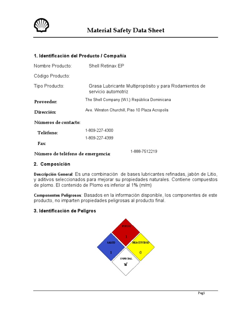 Descripcin General: Es una combinacin de bases lubricantes refinadas, jabn de Litio, 1-888-7512219 1-809-227-4300 1-809-227-4399