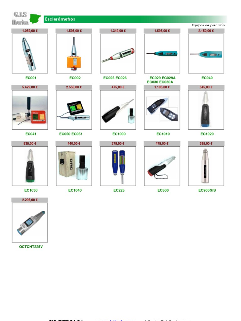 Equipos de precisin EC001 Esclermetro SCHMIDT de PROCEQ Modelo N, para mediciones en hormign rango 10-70 N/mm2, energia de impacto 2207 Nm, con estuche de transporte, dimensiones con embalaje 34x12x12 cm, peso 1.600 gr. Incluye certificado de fabrica. Esclermetro SCHMIDT de PROCEQ Modelo NR, para hormign, rango 10-70 N/mm2, energia de impacto 2207Nm, con sistema de registro sobre papel para 4000 mediciones. Incluye certificado de fabrica. Esclermetro mecnico para hormign, tipo Schmit, rango 100-600Kg/cm2 (9,81 - 58,9 N/mm2), precisin: 18Kg/cm2 (1,8N/mm2), energa de impacto 2,207 Nm. Esclermetro SCHMIDT de PROCEQ Modelo L, para materiales delgados < 100mm o rocas, rango 1070 N/mm2, energia de impacto: 0,735 Nm (tres veces menos que en el esclermetro de hormign). Esclermetro SCHMIDT de PROCEQ, Modelo LR, para materiales delgados < 100mm o rocas, rango 1070 N/mm2, energia de impacto: 0,735 Nm (tres veces menos que en el esclermetro de hormign), con sistema de registro sobre papel para 4000 mediciones Yunque para Esclermetros Original Schmidt, EC001, EC002, EC025, EC026. Esclermetro digital PROCEQ "Silver Schmidt" ST tipo N, para hormigones. Energa de impacto estndar, 2.207 Nm, el objeto de ensayo deber tener un espesor mn. de 100 mm y estar firmemente fijado en la estructura, completo con accesorios standard y maletn. Esclermetro digital PROCEQ "Silver Schmidt" PC tipo N, para hormign con conexin a PC y software, energa de impacto estndar, 2.207 Nm, el objeto de ensayo deber tener un espesor mn. de 100 mm y estar firmemente fijado en la estructura, incluye accesorios estndar, cable PC y software, en bolsa de transporte. Esclermetro digital PROCEQ "Silver Schmidt" ST tipo L para capas de hormign delgado u otros materiales (rocas etc) energa de impacto 0,735 Nm (3 veces menos que en el esclermetro para hormign tipo N). Baja energa de impacto. Apropiado para objetos frgiles o estructuras de menos de 100 mm de espesor, completo con accesorios estndar y maletn. Esclermetro digital PROCEQ "Silver Schmidt" PC tipo L con conexin a PC y software, para capas delgadas de hormign u otros materiales como rocas etc, energa de impacto 0,735 Nm (3 veces menos que el esclermetro tipo N para hormign), se suministra con accesorios estndar, cable PC y software en bolsa de transporte Accesorios para Silver Schmidt. Pistn fungiforme para ensayos con material blando, como por ejemplo hormign reciente, slo para Silver Schmidt tipo L. El punzn seta se ha concebido para la medicin en hormign fresco o de baja resistencia, de 5 a 30 MPa (de 725 a 4,351 psi). Las aplicaciones tpicas se encuentran en el desmontaje de encofrados y en el monitoreo del desarrollo de la resistencia en revestimientos interiores de tneles. Yunque para Esclermetros Silver Schmidt, EC029, EC029A, EC030, EC030A. Adaptador para yunque de calibracin de los esclermetros Original Schmidt (EC026A), para utilizar con los esclermetros Silver Schmidt, EC029, EC029A, EC030, EC030A. Esclermetro digital PROCEQ "Paper Schmidt" para bobinas de papel con conexin a PC y software, energa de impacto 0,735 Nm, incluye software y cable PC, bateras y cargador en bolsa de transporte. Durmetro electrnico Parotester 2 (Proceq), para bobinas de papel, lminas de metal y pelcula plstica, fuerza de contacto 120 N, penetracin mxima 4,0 mm, memoria 5000 valores con salida de datos RS232. Opcionales: Software Parolink 3, Termoimpresora. Software Parolink 3 con cable de datos para Parotester 2 (EC041). Esclermetro digital DIGI SCHMIDT de PROCEQ, Modelo ND, para hormigones, energia de impacto 2.207 Nm, rango 10-70 N/mm2, precisin +- 0,2 R con conexin a ordenador y software incluidos, dispone de ajuste de distintos parmetros de coreccion (forma, edad, composicin direccin de impacto, profundidad, etc). Esclermetro DIGI SCHMIDT de PROCEQ, Modelo LD, para hormign, energa de impacto 0,735 Nm, rango 10-70 N/mm2, precisin +-0,2R, conexin a ordenador y software Yunque de tarado PROCEQ para esclermetros (N/NR/L/LR/Digital). Esclermetro mecnico para hormign "Ectha1000", carcasa de aluminio, mecanismo de acero al carbono inoxidable, energa de impacto 2,207 Nm. Rango de medida: 5 -120 N/mm. Standard ISO/DIS 8045, UNI EN 12504-2, ASTM C805, BS 1881. Incluye certificado de calibracin de fbrica y estuche. Esclermetro digital para hormign "Ectha Plus" con interfaz USB y memoria en tarjeta micro-SD, carcasa de aluminio, mecanismo de acero al carbono inoxidable. Energa de impacto 2,207 Nm. Rango de medida: 5 -120 N/mm. Standard ISO/DIS 8045, UNI EN 12504-2, ASTM C805, BS 1881. Incluye Certificado de calibracin y estuche. Esclermetro para ROCA "Ectha Geohammer", carcasa de aluminio, mecanismo de acero al carbono. Energa de impacto: 0,705 Nm. Rango de medida: 10-250 N/mm. ASTM D5873-00, UNI EN 12504-2. Incluye Certificado de calibracin y estuche. Esclermetro/Penetrmetro para madera "Ectha Wood Pecker", carcasa de aluminio, incluye varilla de acero de 2,5 mm dimetro y 50 mm de longitud y reloj de lectura, con certificado de calibracin y estuche.
