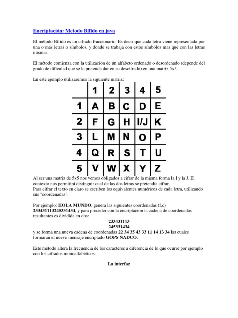 Al ser una matriz de 5x5 nos vemos obligados a cifrar de la misma forma la I y la J. El contexto nos permitir distinguir cual de las dos letras se pretenda cifrar. Para cifrar el texto en claro se escriben los equivalentes numricos de cada letra, utilizando sus "coordenadas". Por ejemplo: HOLA MUNDO, genera las siguientes coordenadas (f,c) 233431113245331434, y para proceder con la encriptacion la cadena de coordenadas resultantes es dividida en dos: 233431113 245331434 y se forma una nueva cadena de coordenadas 22 34 35 43 33 11 14 13 34 las cuales formaran el nuevo mensaje encriptado GOPS NADCO. Este mtodo altera la frecuencia de los caracteres a diferencia de lo que ocurre por ejemplo con los cifrados monoalfabticos. La interfaz