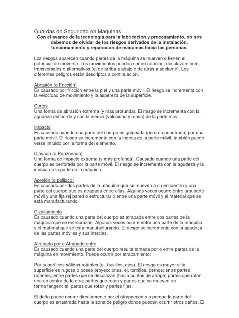 riesgo se incrementa significativamente para personas que utilizan ropa suelta, guantes, corbata o joyera; con cabello largo; utilizando paos para limpiar. Otros Peligros Adems de los descriptos anteriormente, otros peligros pueden estar presentes y deben ser considerados desde la perspectiva de las guardas de mquinas: Peligro de electrocucin Cualquier conductor elctrico expuesto que opera a voltajes mayores a 50 V presenta un peligro de electrocucin; Altas Temperaturas Superficies o materiales calientes pueden presentar riesgos de quemadura en piel expuesta. Esto incluye superficies con temperaturas >65 C (para partes metlicas) y >80 C (para partes de vidrio/cermica), lquidos >50 C y vapores a cualquier temperatura; Bordes Filosos Puntos o bordes filosos pueden causar cortes durante la operacin, limpieza, etc; Materiales proyectados Materiales o partes de la mquina proyectadas pueden causar daos, particularmente a los ojos (si no estn protegidos). Partes de la mquina pueden ser proyectadas por roturas o porque no estn bien sujetas; tambin pueden ser proyectadas herramientas de mantenimiento si no han sido retiradas de la mquina antes de su puesta en funcionamiento. Un material puede ser proyectado si su contenedor, caeras o conexiones fallan. Algunas veces, los materiales son proyectados como parte del funcionamiento normal de la mquina. Energa Almacenada Incluso cuando todas las partes de la mquina estn quietas, sta puede igualmente presentar un riesgo por energa (potencial) almacenada. La energa almacenada puede presentarse de variadas formas: Energa mecnica almacenada (ej. debida a un atasco en una lnea de llenado o empaque) Energa gravitacional almacenada (ej. debida a un contenedor elevado por sobre el piso); Energa almacenada por fluidos (ej. debida a sistemas neumticos o hidrulicos bajo presin, o debida a recipientes bajo presin o vaco); Energa elctrica almacenada (ej. debida a cargas elctricas acumuladas en el sistema). SEGURIDAD INTRNSECA (POR DISEO) Cuando sea posible, los peligros deben ser eliminados durante la etapa de diseo, evitando as el uso de guardas de mquina o reduciendo su cantidad. Cuando no