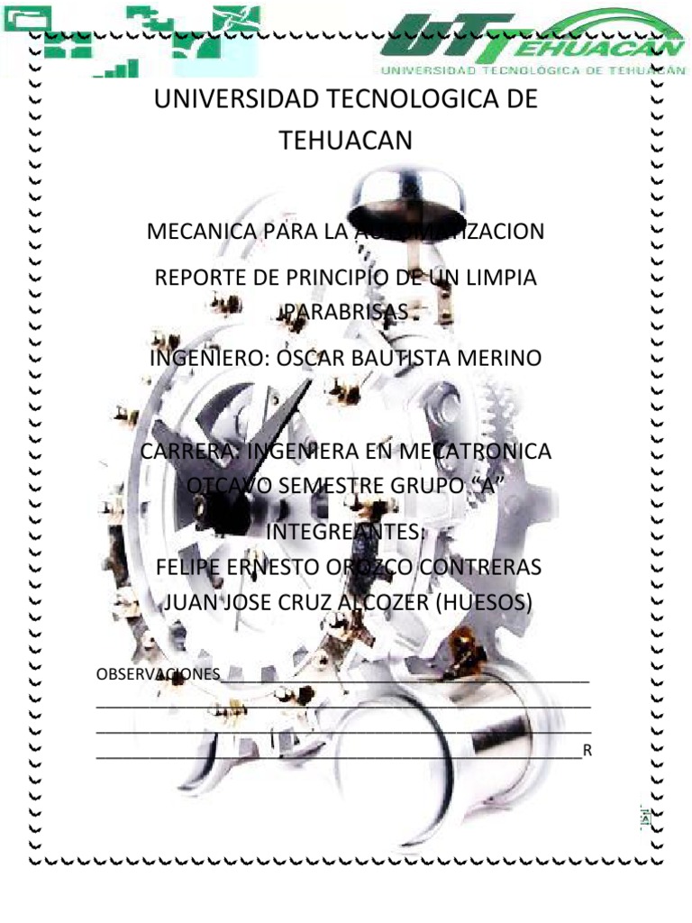MECANICA PARA LA AUTOMATIZACION REPORTE DE PRINCIPIO DE UN LIMPIA PARABRISAS INGENIERO: OSCAR BAUTISTA MERINO