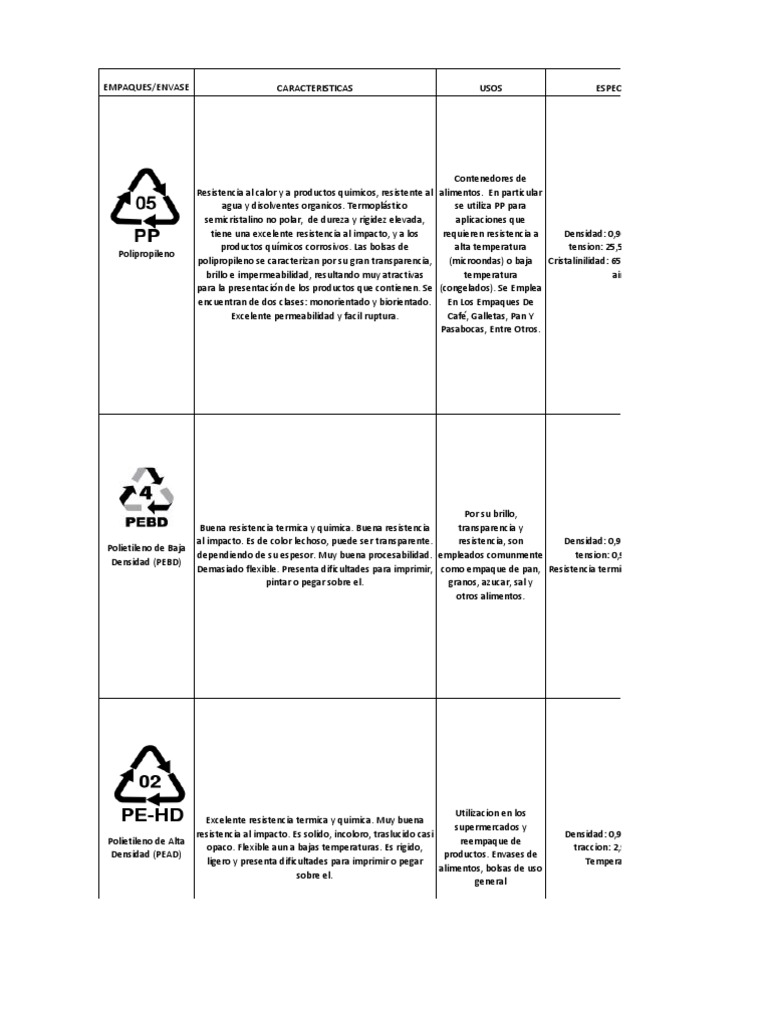 Por su brillo, Buena resistencia termica y quimica. Buena resistencia transparencia y al impacto. Es de color lechoso, puede ser transparente. resistencia, son Densidad: 0,92 y 0,93 g/cm3 Resistencia a la dependiendo de su espesor. Muy buena procesabilidad. empleados comunmente tension: 0,9-2.5 % Elongacion: 550-600 Demasiado flexible. Presenta dificultades para imprimir, como empaque de pan, Resistencia termica:82C- 100C Reciclable: 100% pintar o pegar sobre el. granos, azucar, sal y otros alimentos.