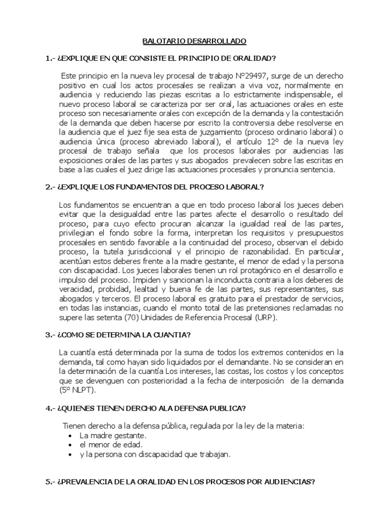 BALOTARIO DESARROLLADO 1.- EXPLIQUE EN QUE CONSISTE EL PRINCIPIO DE ORALIDAD?