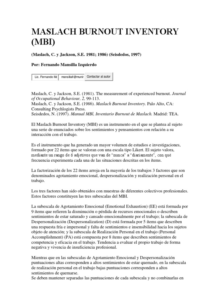 Maslach, C. y Jackson, S.E. (1981). The measurement of experienced burnout. Journal of Occupational Behaviour, 2, 99-113. Maslach, C. y Jackson, S.E. (1986). Maslach Burnout Inventory. Palo Alto, CA: Consulting Psychlogists Press. Seisdedos, N. (1997). Manual MBl, Inventario Burnout de Maslach. Madrid: TEA. El Maslach Burnout Inventory (MBI) es un instrumento en el que se plantea al sujeto una serie de enunciados sobre los sentimientos y pensamientos con relacin a su interaccin con el trabajo. Es el instrumento que ha generado un mayor volumen de estudios e investigaciones, formado por 22 tems que se valoran con una escala tipo Likert. El sujeto valora, mediante un rango de 6 adjetivos que van de nunca a diariamente, con qu frecuencia experimenta cada una de las situaciones descritas en los tems. La factorizacin de los 22 tems arroja en la mayora de los trabajos 3 factores que son denominados agotamiento emocional, despersonalizacin y realizacin personal en el trabajo. Los tres factores han sido obtenidos con muestras de diferentes colectivos profesionales. Estos factores constituyen las tres subescalas del MBI. La subescala de Agotamiento Emocional (Emotional Exhaustion) (EE) est formada por 9 tems que refieren la disminucin o prdida de recursos emocionales o describen sentimientos de estar saturado y cansado emocionalmente por el trabajo; la subescala de Despersonalizacin (Despersonalization) (D) est formada por 5 tems que describen una respuesta fra e impersonal y falta de sentimientos e insensibilidad hacia los sujetos objeto de atencin; y la subescala de Realizacin Personal en el trabajo (Personal Accomplishment) (PA) est compuesta por 8 tems que describen sentimientos de competencia y eficacia en el trabajo. Tendencia a evaluar el propio trabajo de forma negativa y vivencia de insuficiencia profesional. Mientras que en las subescalas de Agotamiento Emocional y Despersonalizacin puntuaciones altas corresponden a altos sentimientos de estar quemado, en la subescala de realizacin personal en el trabajo bajas puntuaciones corresponden a altos sentimientos de quemarse. Se deben mantener separadas las puntuaciones de cada subescala y no combinarlas en