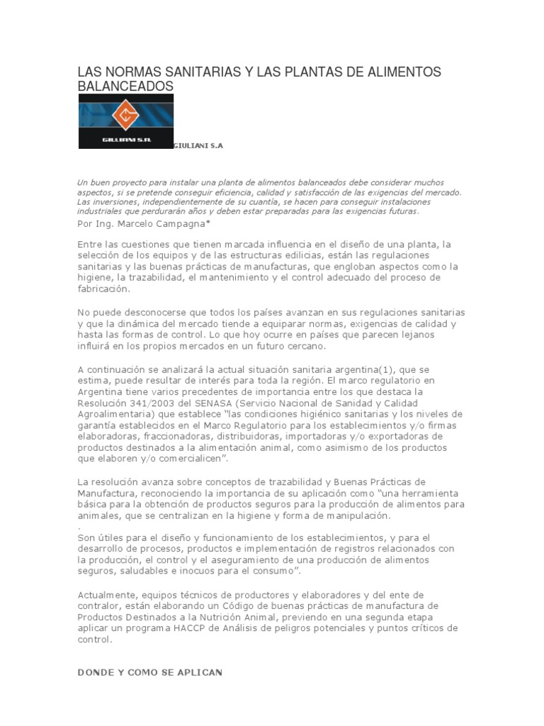 Por Ing. Marcelo Campagna* Entre las cuestiones que tienen marcada influencia en el diseo de una planta, la seleccin de los equipos y de las estructuras edilicias, estn las regulaciones sanitarias y las buenas prcticas de manufacturas, que engloban aspectos como la higiene, la trazabilidad, el mantenimiento y el control adecuado del proceso de fabricacin. No puede desconocerse que todos los pases avanzan en sus regulaciones sanitarias y que la dinmica del mercado tiende a equiparar normas, exigencias de calidad y hasta las formas de control. Lo que hoy ocurre en pases que parecen lejanos influir en los propios mercados en un futuro cercano. A continuacin se analizar la actual situacin sanitaria argentina(1), que se estima, puede resultar de inters para toda la regin. El marco regulatorio en Argentina tiene varios precedentes de importancia entre los que destaca la Resolucin 341/2003 del SENASA (Servicio Nacional de Sanidad y Calidad Agroalimentaria) que establece las condiciones higinico sanitarias y los niveles de garanta establecidos en el Marco Regulatorio para los establecimientos y/o firmas elaboradoras, fraccionadoras, distribuidoras, importadoras y/o exportadoras de productos destinados a la alimentacin animal, como asimismo de los productos que elaboren y/o comercialicen. La resolucin avanza sobre conceptos de trazabilidad y Buenas Prcticas de Manufactura, reconociendo la importancia de su aplicacin como una herramienta bsica para la obtencin de productos seguros para la produccin de alimentos para animales, que se centralizan en la higiene y forma de manipulacin. . Son tiles para el diseo y funcionamiento de los establecimientos, y para el desarrollo de procesos, productos e implementacin de registros relacionados con la produccin, el control y el aseguramiento de una produccin de alimentos seguros, saludables e inocuos para el consumo. Actualmente, equipos tcnicos de productores y elaboradores y del ente de contralor, estn elaborando un Cdigo de buenas prcticas de manufactura de Productos Destinados a la Nutricin Animal, previendo en una segunda etapa aplicar un programa HACCP de Anlisis de peligros potenciales y puntos crticos de control. DONDE Y COMO SE APLICAN