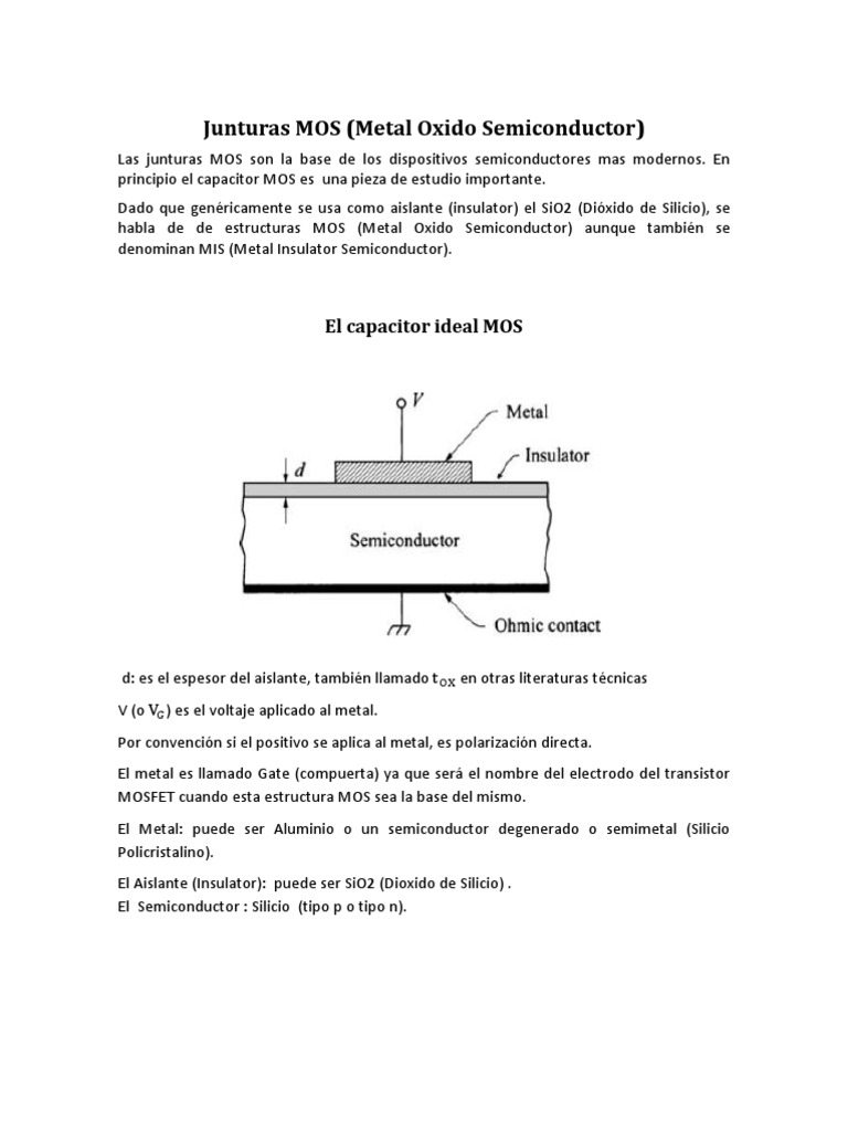 Las junturas MOS son la base de los dispositivos semiconductores mas modernos. En principio el capacitor MOS es una pieza de estudio importante. Dado que genricamente se usa como aislante (insulator) el SiO2 (Dixido de Silicio), se habla de de estructuras MOS (Metal Oxido Semiconductor) aunque tambin se denominan MIS (Metal Insulator Semiconductor).