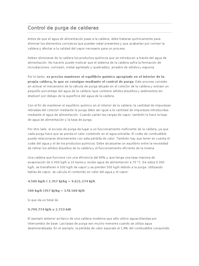 Antes de que el agua de alimentacin pase a la caldera, debe tratarse qumicamente para eliminar los elementos corrosivos que puedan estar presentes y que acabaran por corroer la caldera y afectar a la calidad del vapor necesario para un proceso. Deben eliminarse de la caldera los productos qumicos que se introducen a travs del agua de alimentacin. No hacerlo puede motivar que el sistema de la caldera sufra la formacin de incrustaciones, corrosin, metal agrietado y quebradizo, arrastre de slidos y espuma. Por lo tanto, es preciso mantener el equilibrio qumico apropiado en el interior de la propia caldera, lo que se consigue mediante el control de purga. Este proceso consiste en activar el mecanismo de la vlvula de purga situado en el colector de la caldera y extraer un pequeo porcentaje del agua de la caldera (que contiene slidos disueltos y sedimentos sin disolver) por debajo de la superficie del agua de la caldera. Con el fin de mantener el equilibrio qumico en el interior de la caldera, la cantidad de impurezas retiradas del colector mediante la purga debe ser igual a la cantidad de impurezas introducidas mediante el agua de alimentacin. Cuando varan las cargas de vapor, tambin lo hace la tasa de agua de alimentacin y la tasa de purga. Por otro lado, el exceso de purga da lugar a un funcionamiento ineficiente de la caldera, ya que cada purga hace que se pierda el calor contenido en el agua extrada. El coste de combustible puede relacionarse directamente con esta prdida de calor. Tambin hay que tener en cuenta el coste del agua y el de los productos qumicos. Debe alcanzarse un equilibrio entre la necesidad de retirar los slidos disueltos de la caldera y el funcionamiento eficiente de la misma. Una caldera que funcione con una eficiencia del 80% y que tenga una tasa mxima de evaporacin de 5.000 kg/h a 10 bares y recibe agua de alimentacin a 70 C. De estos 5.000 kg/h, se transfieren 4.500 kg/h de vapor y se pierden 500 kg/h debido a la purga. Utilizando tablas de vapor, se calcula el contenido en calor del agua y el vapor: 4.500 kg/h ( 2.357 kJ/kg = 9.621.274 kJ/h 500 kg/h (357 kJ/kg = 178.500 kJ/h lo que da un total de 9.799.774 kJ/h o 2.723 kW El ejemplo anterior es tpico de una caldera moderna que slo utilice aguas blandas por intercambio de base. Las tasas de purga son mucho menores cuando se utiliza agua desmineralizada. En el ejemplo, la prdida de calor equivale al 1,8% del combustible consumido.
