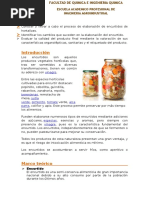 INTRODUCCIN Se llama encurtidos a los vegetales u hortalizas que se conservan por acidificacin. Ello puede lograrse mediante la adicin de sal comn, que origina una fermentacin lctica espontnea del azcar del vegetal (encurtidos fermentados), o aadiendo directamente cido actico o vinagre al vegetal (encurtidos no fermentados). El encurtido permite conservar los productos vegetales durante mucho tiempo, y tiene la ventaja de que sus caractersticas nutritivas y organolpticas se mantienen. En la elaboracin de encurtidos dependen mucho los gustos, las costumbres y las tradiciones, as como la preferencia por sabores dulces, cidos, agridulces o picantes. En esta cartilla mencionaremos las diversas clasificaciones y trataremos en forma detallada la elaboracin de encurtidos no fermentados. Encurtidos fermentados Se elaborarn mediante la fermentacin del azcar de los vegetales. El proceso se inicia ante una determinada concentracin de sal (10%), que debe mantenerse constante. La elaboracin de estos encurtidos tarda entre uno y