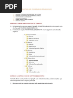 1. Pulsa Inicio y elige Documentos. Se abre el Explorador de Windows y nos sita directamente en esa carpeta. 2. Pulsa el botn Nueva carpeta en la barra de herramientas. 3. Llmala Practicas. No olvides pulsar la tecla ENTRAR cuando acabes de escribir el nombre, para que se guarde y salga del modo edicin. 4. brela para situarte dentro de ella, mediante y doble clic. 5. Haz clic en el botn Nueva Carpeta y llmala Ejercicio 1. 6. Vuelve a hacer clic en el botn Nueva Carpeta y llmala Ejercicio 2. 7. Selecciona ambas carpetas, Ejercicio 1 y Ejercicio 2 utilizando el mtodo que prefieras. Por ejemplo: Hazles clic mientras mantienes pulsada la tecla Ctrl. 8. Pulsa el botn derecho del ratn y elige Copiar. 9. Abre la carpeta Ejercicio 2. 10. Pulsa el botn Organizar y elige Pegar. Como hemos copiado dos carpetas vacas, nos ahorramos tener que crearlas. 11. Renmbralas a Ejer 21 y Ejer 22 utilizando el mtodo que prefieras. Por ejemplo: Seleccionas una carpeta y pulsas la tecla F2 y repites la operacin con la otra. Para crear los dos documentos de texto archivo 221 y archivo 222 en la carpeta Ejer 22: 1. Abre la carpeta Ejer 22. 2. Haz clic con el botn derecho del ratn sobre la superficie de la Lista de Archivos: Elige Nuevo en el men contextual y haz clic en Documento de texto. 3. Cmbiale el nombre a archivo 221.