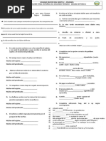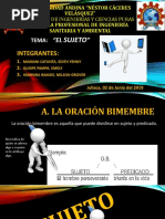 Uso del Sujeto.- Es aquel de quien se dice algo o quin realiza la accin. Existen dos tipos de sujeto: Sujeto Tcito: es el que no est escrito, pero se encuentra implcito en la oracin. Fuimos al cine sujeto tcito: nosotros Sujeto Expreso: sujeto que se encuentra escrito en la oracin. Pablo habl con dificultad sujeto expreso: Pablo Para encontrar el sujeto en la oracin, primero debemos localizar el verbo y posteriormente preguntarle Quin? Ncleo del sujeto: es la parte medular, la palabra sin la cual la oracin pierde sentido. Las alas de caro se deshicieron con el sol. N.S. Uso del predicado.- Es lo que se dice del sujeto. El predicado se clasifica en: Predicado Verbal: lleva un verbo personal conjugado; nos indica lo que realiza el sujeto. Los mdicos diagnosticaron el padecimiento de Martn. Verbo - Predicado Nominal: utiliza los verbos ser, estar o parece y nos indica una cualidad o condicin del sujeto: Rodrigo est furioso por los resultados del examen. Verbo Ncleo del predicado: es el verbo. El predicado tiene complementos: 1. Complemento directo: Para encontrarlo preguntaremos Qu? Al verbo. 2. Complemento indirecto: Para encontrarlo preguntaremos A quin(es) o para quin(es)? al verbo. 3. Complementos Circunstanciales: Para encontrarlo preguntaremos al verbo Cmo? (modo), cundo? (tiempo), dnde? (lugar), cunto? (cantidad), con qu? (instrumento), con quin? (compaa), para qu? (finalidad), por qu? (causa). Ejemplo: En das calurosos, las monjas de la Santsima Trinidad hacen mucha agua fresca, CCT SUJETO NP CCC CD con frutas de temporada, para los fieles CCI CI Ejercicio 5: Identifique qu tipo de sujeto se encuentra en las siguientes oraciones: 1.- Estaban demasiado cansados para continuar a) expreso b) tcito c) nominal 2.- Son abundantes y majestuosos los manantiales que corren en mi pueblo. a) expreso b) tcito c) nominal 3.- Sin embargo, nos proporcion toda la informacin a) nominal b) tcito 4.- Los alumnos estaban discutiendo sobre la nueva ley. a) expreso b) nominal c) verbal c) tcito