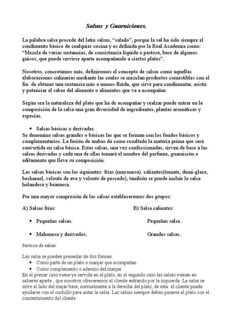 La palabra salsa procede del latn salsus, salado, porque la sal ha sido siempre el condimento bsico de cualquier cocina y es definida por la Real Academia como: Mezcla de varias sustancias, de consistencia lquida o pastosa, base de algunos guisos, que puede servirse aparte acompaando a ciertos platos. Nosotros, concretamos ms, definiremos el concepto de salsas como aquellas elaboraciones culinarias mediante las cuales se mezclan productos comestibles con el fin de obtener una sustancia ms o menos fluida, que sirve para condimentar, asistir y potenciar el sabor del alimento o alimentos que va a acompaar. Segn sea la naturaleza del plato que ha de acompaar y realzar puede entrar en la composicin de la salsa una gran diversidad de ingredientes, plantas aromticas y especias. Salsas bsicas o derivadas. Se denomina salsas grandes o bsicas las que se forman con los fondos bsicos y complementarios. La fusin de ambas da como resultado la materia prima que ser convertida en salsa bsica. Estas salsas, una vez confeccionadas, sirven de base a las salsas derivadas y cada una de ellas tomar el nombre del perfume, guarnicin o aditamento que lleve su composicin. Las salsas bsicas son las siguientes: fras (mayonesa). calientes(tomate, demi-glace, bechamel, veloute de ave y veloute de pescado), tambin se puede incluir la salsa holandesa y bearnesa. Por una mayor compresin de las salsas estableceremos dos grupos: A) Salsas fras: Pequeas salsas. Mahonesa y derivados.