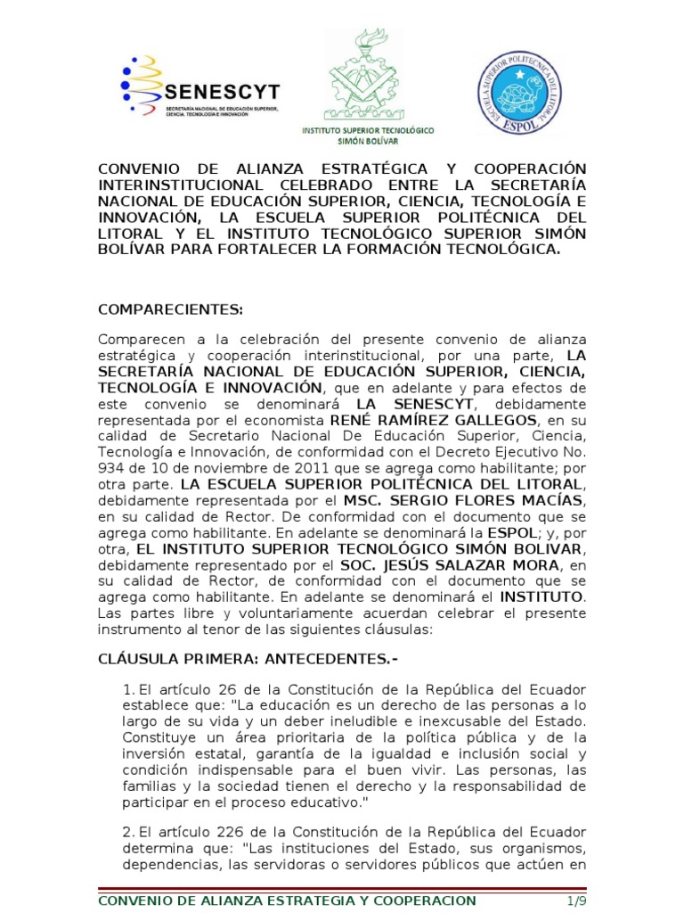 COMPARECIENTES: Comparecen a la celebracin del presente convenio de alianza estratgica y cooperacin interinstitucional, por una parte, LA SECRETARA NACIONAL DE EDUCACIN SUPERIOR, CIENCIA, TECNOLOGA E INNOVACIN, que en adelante y para efectos de este convenio se denominar LA SENESCYT, debidamente representada por el economista REN RAMREZ GALLEGOS, en su calidad de Secretario Nacional De Educacin Superior, Ciencia, Tecnologa e Innovacin, de conformidad con el Decreto Ejecutivo No. 934 de 10 de noviembre de 2011 que se agrega como habilitante; por otra parte. LA ESCUELA SUPERIOR POLITCNICA DEL LITORAL, debidamente representada por el MSC. SERGIO FLORES MACAS, en su calidad de Rector. De conformidad con el documento que se agrega como habilitante. En adelante se denominar la ESPOL; y, por otra, EL INSTITUTO SUPERIOR TECNOLGICO SIMN BOLIVAR, debidamente representado por el SOC. JESS SALAZAR MORA, en su calidad de Rector, de conformidad con el documento que se agrega como habilitante. En adelante se denominar el INSTITUTO. Las partes libre y voluntariamente acuerdan celebrar el presente instrumento al tenor de las siguientes clusulas: CLUSULA PRIMERA: ANTECEDENTES.1. El artculo 26 de la Constitucin de la Repblica del Ecuador establece que: "La educacin es un derecho de las personas a lo largo de su vida y un deber ineludible e inexcusable del Estado. Constituye un rea prioritaria de la poltica pblica y de la inversin estatal, garanta de la igualdad e inclusin social y condicin indispensable para el buen vivir. Las personas, las familias y la sociedad tienen el derecho y la responsabilidad de participar en el proceso educativo." 2. El artculo 226 de la Constitucin de la Repblica del Ecuador determina que: "Las instituciones del Estado, sus organismos, dependencias, las servidoras o servidores pblicos que acten en