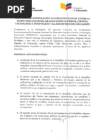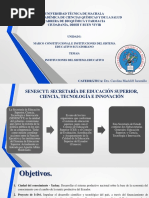 establecido en la Disposicin Transitoria Vigsima Segunda de la presente Ley." 9. El artculo 182 de la ley antes referida dispone que: "La Secretara Nacional de Educacin Superior, Ciencia, Tecnologa e Innovacin, SENESCYT, es el rgano que tiene por objeto ejercer la rectora de la poltica pblica de educacin superior y coordinar acciones entre la Funcin Ejecutiva y las instituciones del sistema de educacin superior ... "