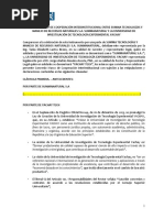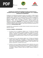 Tecnologa e Innovacin, el informe del avance, desenvolvimiento y resultados de las actividades' desarrolladas por las partes. CLUSULA QUINTA: FINANCIAMIENTO.En el evento de realizarse cualquier actividad conjunta en cumplimiento del presente convenio a travs de convenios especficos que requieran de financiamiento, las partes debern acordar previa y expresamente las condiciones legales bajo las cuales se desarrollen y debern contar con el presupuesto correspondiente. CLUSULA SEXTA: VIGENCIA.El presente convenio tendr una vigencia de 5 aos, contados a partir de la fecha de su suscripcin, pudiendo renovarse previo informe de la comisin responsable del seguimiento del presente instrumento, de convenir a los intereses de las partes, renovacin que deber hacerse por manifestacin expresa escrita de las partes realizada con 180 das calendario de anticipacin a la fecha de terminacin del convenio. As mismo, podr establecerse un plazo mayor, igual o menor, de convenir a los intereses institucionales. CLUSULA SPTIMA: MODIFICACIONES.Los trminos de este convenio podrn ser modificados, ampliados o reformados de mutuo acuerdo durante su vigencia, siempre que dichos cambios no alteren su objeto ni desnaturalicen su contenido, para lo cual las partes suscribirn los instrumentos que sean necesarios. CLUSULA OCTAVA: TERMINACIN DE CONVENIO.El presente convenio termina por las siguientes causales: a) Por cumplimiento del plazo del convenio. b) Por mutuo acuerdo de las partes, siempre que no se afecte a terceros cuando por casos de fuerza mayor o caso fortuito, se haga imposible continuar con la ejecucin del convenio. c) Por sentencia ejecutoriada que declare la terminacin o nulidad del convenio a pedido de cualquiera de las partes. d) Por terminacin unilateral del convenio, por cualquiera de las partes, por incumplimiento de obligaciones de cualquiera de las .partes, situacin que ser comunicada a las otras por lo menos