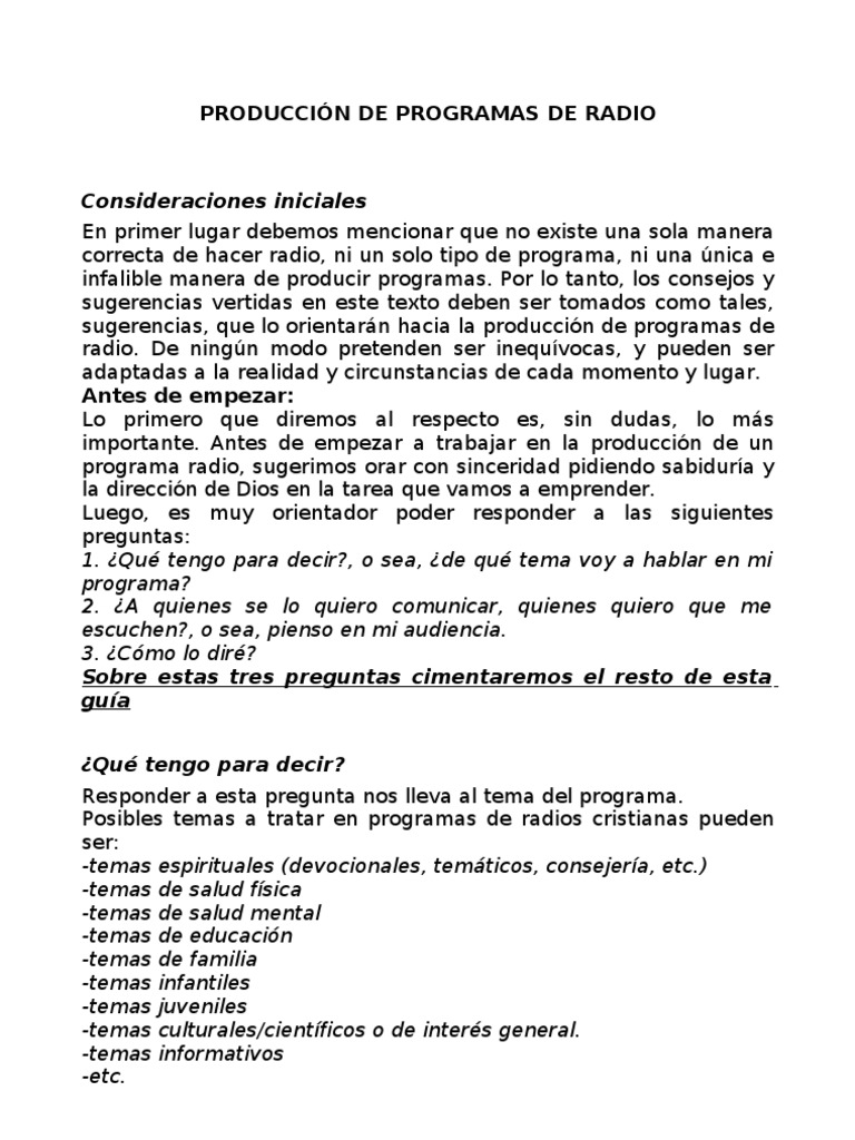 Consideraciones iniciales En primer lugar debemos mencionar que no existe una sola manera correcta de hacer radio, ni un solo tipo de programa, ni una nica e infalible manera de producir programas. Por lo tanto, los consejos y sugerencias vertidas en este texto deben ser tomados como tales, sugerencias, que lo orientarn hacia la produccin de programas de radio. De ningn modo pretenden ser inequvocas, y pueden ser adaptadas a la realidad y circunstancias de cada momento y lugar. Antes de empezar: Lo primero que diremos al respecto es, sin dudas, lo ms importante. Antes de empezar a trabajar en la produccin de un programa radio, sugerimos orar con sinceridad pidiendo sabidura y la direccin de Dios en la tarea que vamos a emprender. Luego, es muy orientador poder responder a las siguientes preguntas: 1. Qu tengo para decir?, o sea, de qu tema voy a hablar en mi programa? 2. A quienes se lo quiero comunicar, quienes quiero que me escuchen?, o sea, pienso en mi audiencia. 3. Cmo lo dir? Sobre estas tres preguntas cimentaremos el resto de esta gua Qu tengo para decir? Responder a esta pregunta nos lleva al tema del programa. Posibles temas a tratar en programas de radios cristianas pueden ser: -temas espirituales (devocionales, temticos, consejera, etc.) -temas de salud fsica -temas de salud mental -temas de educacin -temas de familia -temas infantiles -temas juveniles -temas culturales/cientficos o de inters general. -temas informativos -etc.