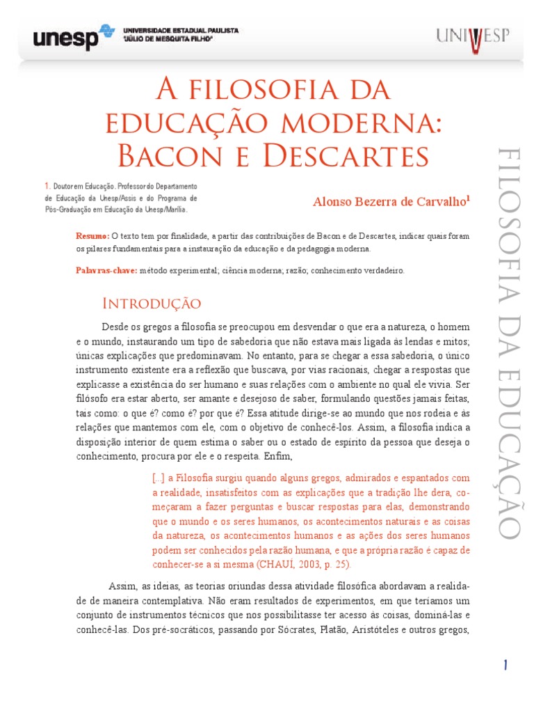 Resumo: O texto tem por finalidade, a partir das contribuies de Bacon e de Descartes, indicar quais foram os pilares fundamentais para a instaurao da educao e da pedagogia moderna. Palavras-chave: mtodo experimental; cincia moderna; razo; conhecimento verdadeiro.