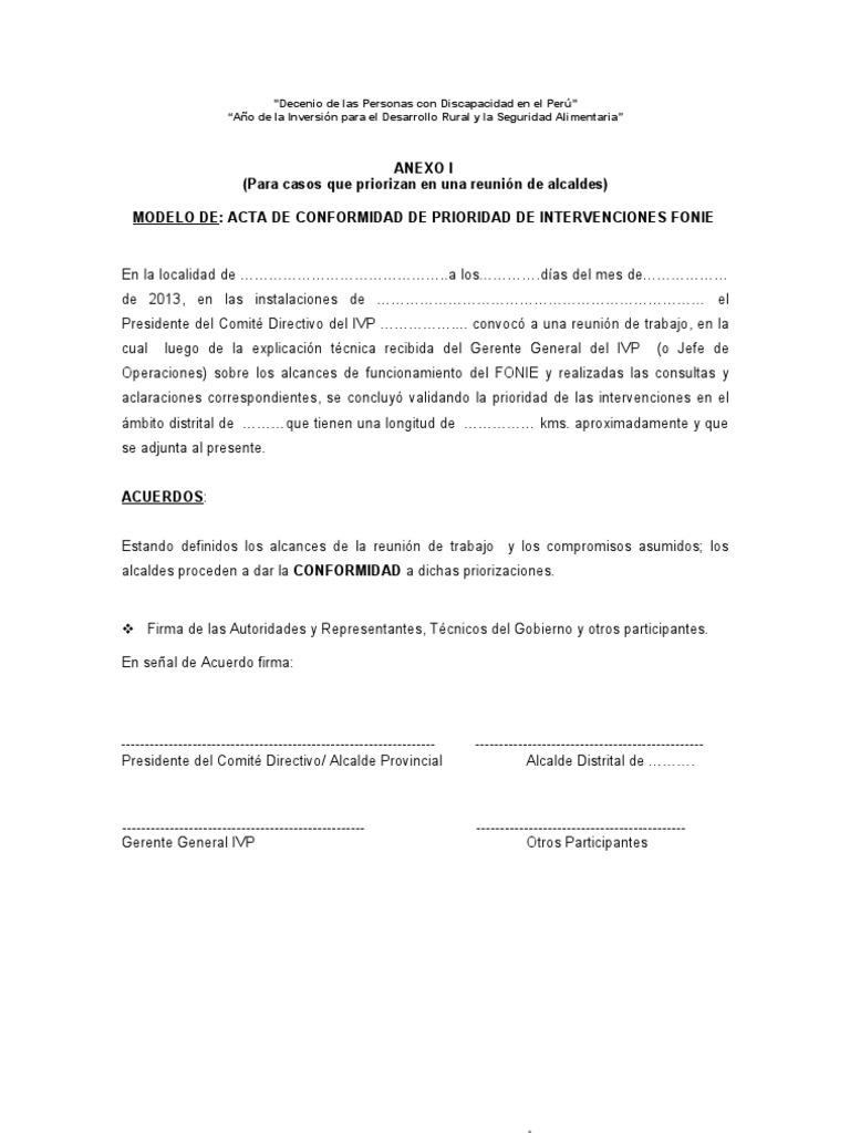 En la localidad de ..a los.das del mes de de 2013, en las instalaciones de el Presidente del Comit Directivo del IVP .... convoc a una reunin de trabajo, en la cual luego de la explicacin tcnica recibida del Gerente General del IVP (o Jefe de Operaciones) sobre los alcances de funcionamiento del FONIE y realizadas las consultas y aclaraciones correspondientes, se concluy validando la prioridad de las intervenciones en el mbito distrital de que tienen una longitud de kms. aproximadamente y que se adjunta al presente. ACUERDOS: Estando definidos los alcances de la reunin de trabajo y los compromisos asumidos; los alcaldes proceden a dar la CONFORMIDAD a dichas priorizaciones.