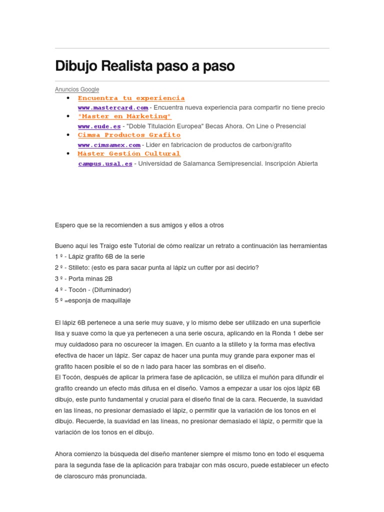 Espero que se la recomienden a sus amigos y ellos a otros Bueno aqu les Traigo este Tutorial de cmo realizar un retrato a continuacin las herramientas 1 - Lpiz grafito 6B de la serie 2 - Stilleto: (esto es para sacar punta al lpiz un cutter por asi decirlo? 3 - Porta minas 2B 4 - Tocn - (Difuminador) 5 =esponja de maquillaje El lpiz 6B pertenece a una serie muy suave, y lo mismo debe ser utilizado en una superficie lisa y suave como la que ya pertenecen a una serie oscura, aplicando en la Ronda 1 debe ser muy cuidadoso para no oscurecer la imagen. En cuanto a la stilleto y la forma mas efectiva efectiva de hacer un lpiz. Ser capaz de hacer una punta muy grande para exponer mas el grafito hacen posible el so de n lado para hacer las sombras en el diseo. El Tocn, despus de aplicar la primera fase de aplicacin, se utiliza el mun para difundir el grafito creando un efecto ms difusa en el diseo. Vamos a empezar a usar los ojos lpiz 6B dibujo, este punto fundamental y crucial para el diseo final de la cara. Recuerde, la suavidad en las lneas, no presionar demasiado el lpiz, o permitir que la variacin de los tonos en el dibujo. Recuerde, la suavidad en las lneas, no presionar demasiado el lpiz, o permitir que la variacin de los tonos en el dibujo. Ahora comienzo la bsqueda del diseo mantener siempre el mismo tono en todo el esquema para la segunda fase de la aplicacin para trabajar con ms oscuro, puede establecer un efecto de claroscuro ms pronunciada.