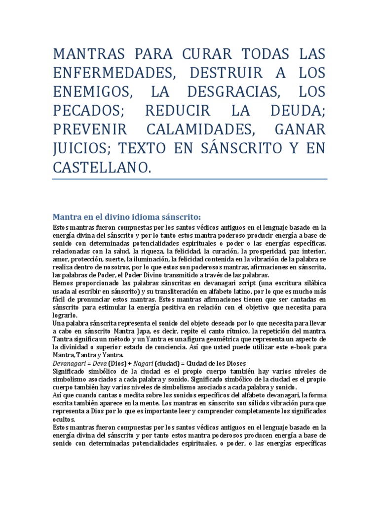 relacionadas con la salud, la riqueza, la felicidad, la curacin, la prosperidad, paz interior, amor, proteccin, suerte, la iluminacin, la felicidad contenida en la vibracin de la palabra, se realiza dentro de nosotros, por lo que estos son poderosos mantras, afirmaciones snscritas, las palabras de Poder, el Poder Divino transmitido a travs de las palabras. Es una coleccin de los ms venerados y poderosos mantras incluyendo mantras para la vida bien equilibrada (de todos los mantras en los Vedas), por lo que no tiene que leer o comprar muchos libros. Coleccin de los "mantras ms poderosos", junto con su traduccin al castellano.