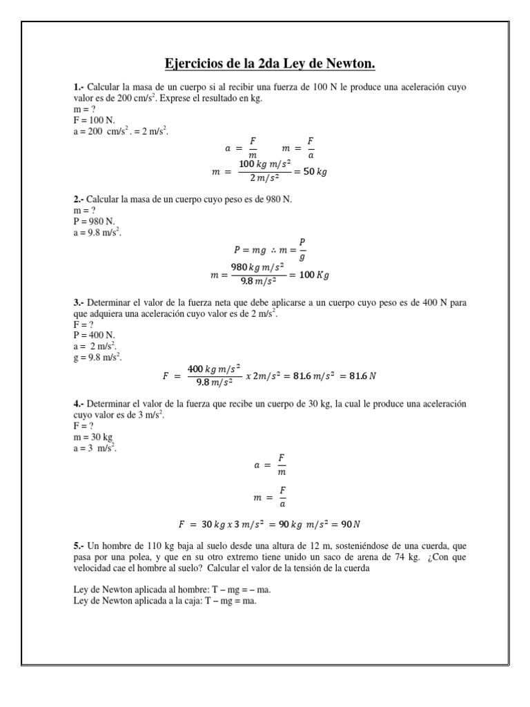1.- Calcular la masa de un cuerpo si al recibir una fuerza de 100 N le produce una aceleracin cuyo valor es de 200 cm/s2. Exprese el resultado en kg. m=? F = 100 N. a = 200 cm/s2 . = 2 m/s2.