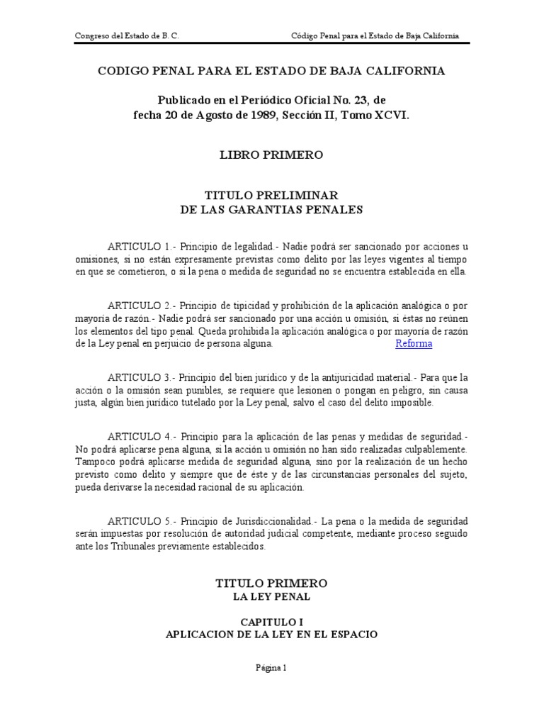 CODIGO PENAL PARA EL ESTADO DE BAJA CALIFORNIA Publicado en el Peridico Oficial No. 23, de fecha 20 de Agosto de 1989, Seccin II, Tomo XCVI. LIBRO PRIMERO TITULO PRELIMINAR DE LAS GARANTIAS PENALES