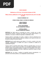 ARTICULO 1.- Principio de legalidad.- Nadie podr ser sancionado por acciones u omisiones, si no estn expresamente previstas como delito por las leyes vigentes al tiempo en que se cometieron, o si la pena o medida de seguridad no se encuentra establecida en ella. ARTICULO 2.- Principio de tipicidad y prohibicin de la aplicacin analgica o por mayora de razn.- Nadie podr ser sancionado por una accin u omisin, si stas no renen los elementos del tipo penal. Queda prohibida la aplicacin analgica o por mayora de razn de la Ley penal en perjuicio de persona alguna. Reforma ARTICULO 3.- Principio del bien jurdico y de la antijuricidad material.- Para que la accin o la omisin sean punibles, se requiere que lesionen o pongan en peligro, sin causa justa, algn bien jurdico tutelado por la Ley penal, salvo el caso del delito imposible. ARTICULO 4.- Principio para la aplicacin de las penas y medidas de [Link] podr aplicarse pena alguna, si la accin u omisin no han sido realizadas culpablemente. Tampoco podr aplicarse medida de seguridad alguna, sino por la realizacin de un hecho previsto como delito y siempre que de ste y de las circunstancias personales del sujeto, pueda derivarse la necesidad racional de su aplicacin. ARTICULO 5.- Principio de Jurisdiccionalidad.- La pena o la medida de seguridad sern impuestas por resolucin de autoridad judicial competente, mediante proceso seguido ante los Tribunales previamente establecidos.