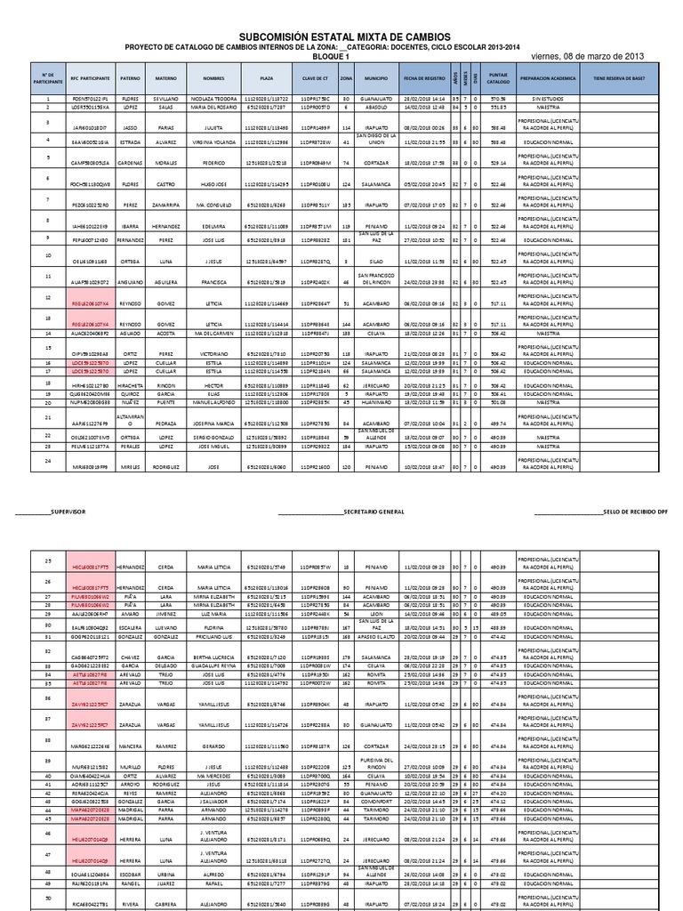 PROYECTO DE CATALOGO DE CAMBIOS INTERNOS DE LA ZONA: __CATEGORIA: DOCENTES, CICLO ESCOLAR 2013-2014