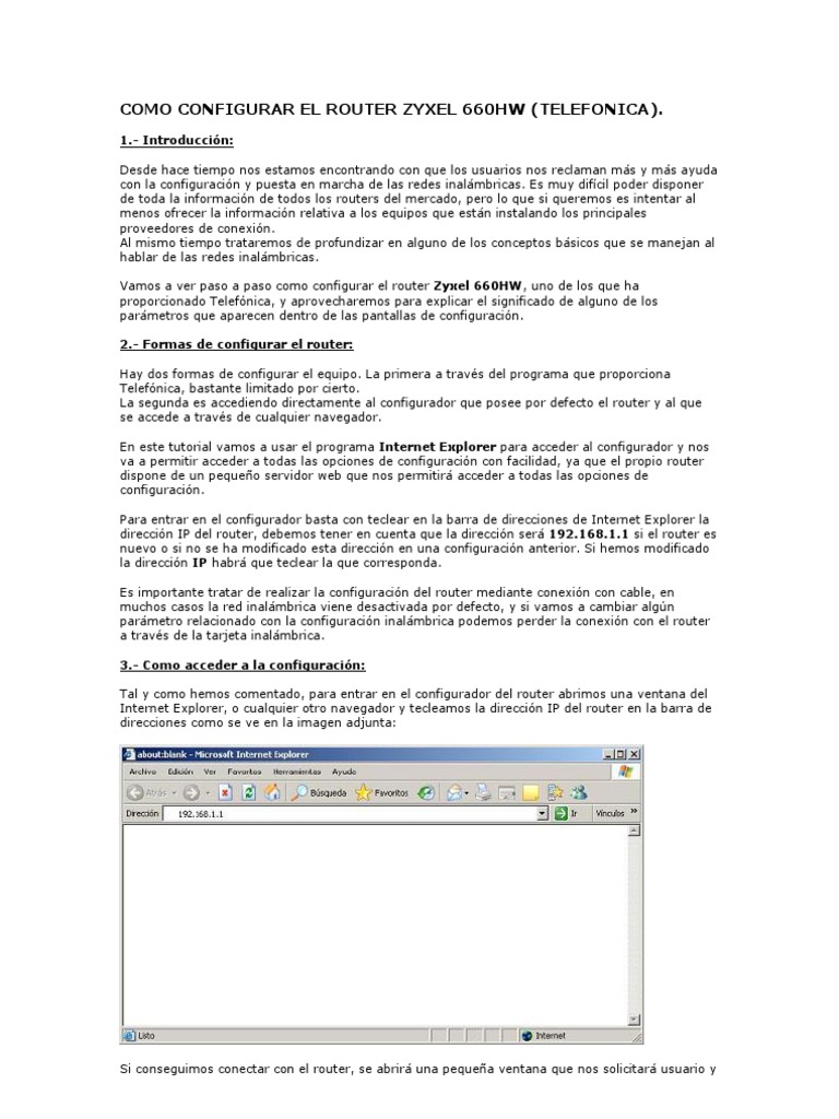 1.- Introduccin: Desde hace tiempo nos estamos encontrando con que los usuarios nos reclaman ms y ms ayuda con la configuracin y puesta en marcha de las redes inalmbricas. Es muy difcil poder disponer de toda la informacin de todos los routers del mercado, pero lo que si queremos es intentar al menos ofrecer la informacin relativa a los equipos que estn instalando los principales proveedores de conexin. Al mismo tiempo trataremos de profundizar en alguno de los conceptos bsicos que se manejan al hablar de las redes inalmbricas. Vamos a ver paso a paso como configurar el router Zyxel 660HW, uno de los que ha proporcionado Telefnica, y aprovecharemos para explicar el significado de alguno de los parmetros que aparecen dentro de las pantallas de configuracin. 2.- Formas de configurar el router: Hay dos formas de configurar el equipo. La primera a travs del programa que proporciona Telefnica, bastante limitado por cierto. La segunda es accediendo directamente al configurador que posee por defecto el router y al que se accede a travs de cualquier navegador. En este tutorial vamos a usar el programa Internet Explorer para acceder al configurador y nos va a permitir acceder a todas las opciones de configuracin con facilidad, ya que el propio router dispone de un pequeo servidor web que nos permitir acceder a todas las opciones de configuracin. Para entrar en el configurador basta con teclear en la barra de direcciones de Internet Explorer la direccin IP del router, debemos tener en cuenta que la direccin ser 192.168.1.1 si el router es nuevo o si no se ha modificado esta direccin en una configuracin anterior. Si hemos modificado la direccin IP habr que teclear la que corresponda. Es importante tratar de realizar la configuracin del router mediante conexin con cable, en muchos casos la red inalmbrica viene desactivada por defecto, y si vamos a cambiar algn parmetro relacionado con la configuracin inalmbrica podemos perder la conexin con el router a travs de la tarjeta inalmbrica. 3.- Como acceder a la configuracin: Tal y como hemos comentado, para entrar en el configurador del router abrimos una ventana del Internet Explorer, o cualquier otro navegador y tecleamos la direccin IP del router en la barra de direcciones como se ve en la imagen adjunta: