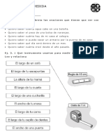 Trabajar con orden para difeEsquema conceptual de partida: renciar medidas no convencio- Identicar medidas no convencionales, su utilidad y nales de las convencionales. limitaciones. Reconocer la utilidad del metro como unidad de medida de longitud del Sistema Internacional en estimaciones. Construccin del conocimiento: Utilizar el material concreto para elaborar un metro. Identicar los submltiplos del metro. Reconocer la utilidad del metro. Medir elementos del entorno. Utilizar las equivalencias entre el metro y sus submltiplos en mediciones. Transferencia del conocimiento: Utilizar el metro y sus submltiplos en la medicin de objetos del medio. Resolver ejercicios y problemas de medicin.