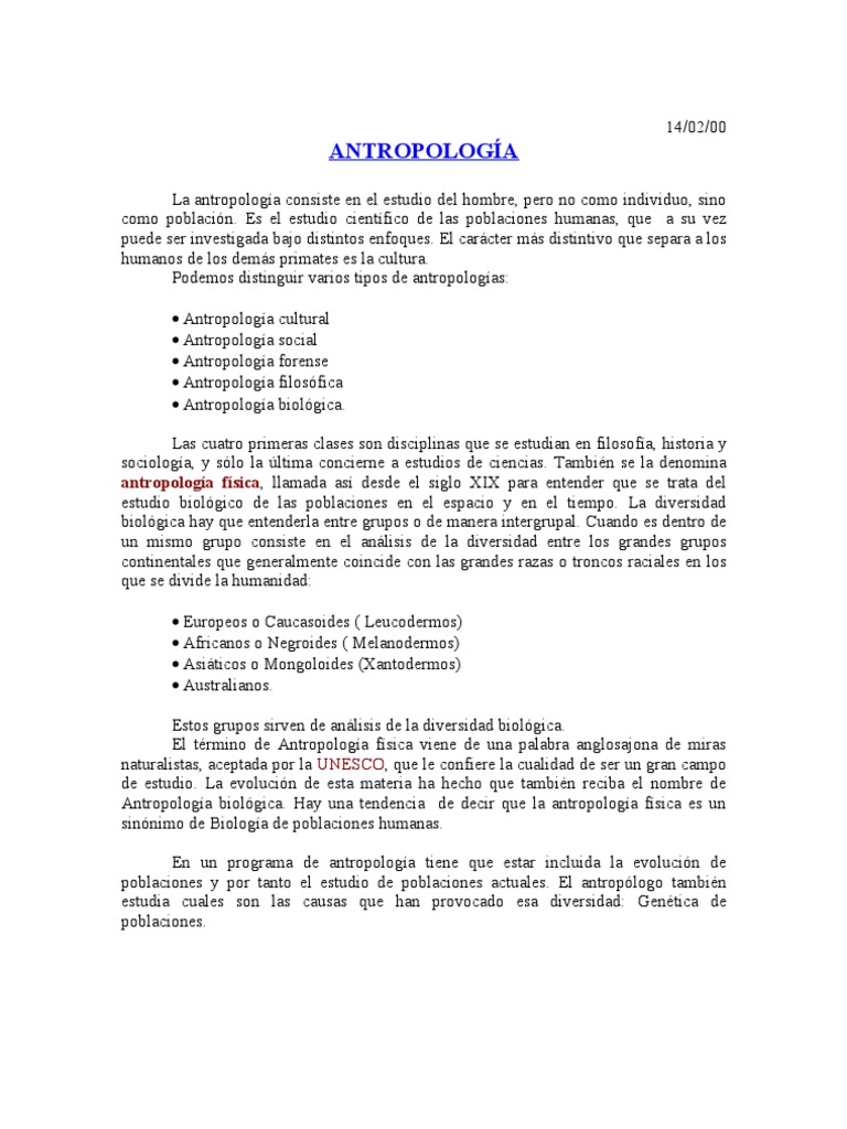 La antropologa consiste en el estudio del hombre, pero no como individuo, sino como poblacin. Es el estudio cientfico de las poblaciones humanas, que a su vez puede ser investigada bajo distintos enfoques. El carcter ms distintivo que separa a los humanos de los dems primates es la cultura. Podemos distinguir varios tipos de antropologas: Antropologa cultural Antropologa social Antropologa forense Antropologa filosfica Antropologa biolgica. Las cuatro primeras clases son disciplinas que se estudian en filosofa, historia y sociologa, y slo la ltima concierne a estudios de ciencias. Tambin se la denomina antropologa fsica, llamada as desde el siglo XIX para entender que se trata del estudio biolgico de las poblaciones en el espacio y en el tiempo. La diversidad biolgica hay que entenderla entre grupos o de manera intergrupal. Cuando es dentro de un mismo grupo consiste en el anlisis de la diversidad entre los grandes grupos continentales que generalmente coincide con las grandes razas o troncos raciales en los que se divide la humanidad: Europeos o Caucasoides ( Leucodermos) Africanos o Negroides ( Melanodermos) Asiticos o Mongoloides (Xantodermos) Australianos. Estos grupos sirven de anlisis de la diversidad biolgica. El trmino de Antropologa fsica viene de una palabra anglosajona de miras naturalistas, aceptada por la UNESCO, que le confiere la cualidad de ser un gran campo de estudio. La evolucin de esta materia ha hecho que tambin reciba el nombre de Antropologa biolgica. Hay una tendencia de decir que la antropologa fsica es un sinnimo de Biologa de poblaciones humanas. En un programa de antropologa tiene que estar incluida la evolucin de poblaciones y por tanto el estudio de poblaciones actuales. El antroplogo tambin estudia cuales son las causas que han provocado esa diversidad: Gentica de poblaciones.