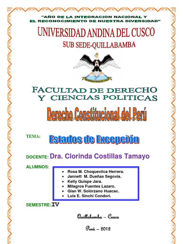 Sra. Docente CLORINDA COSTILLAS TAMAYO de la Asignatura de DERECHO CONSTITUCIONAL DEL PERU de la Universidad Andina del Cusco Sede Quilla bamba. Hacemos entrega del siguiente trabajo, ya que al tener conocimiento sobre estos temas es muy importante para el avance de la asignatura. El presente trabajo est realizado con mucho esfuerzo, vimos que este contenido es muy extenso y de suma importancia, por tal razn es grato exponer este tema con mucha dedicacin y esperando que el trabajo realizado pueda ser utilizado como material de consulta, para todo aquel que tenga deseo de poder aprender. Sus alumnos