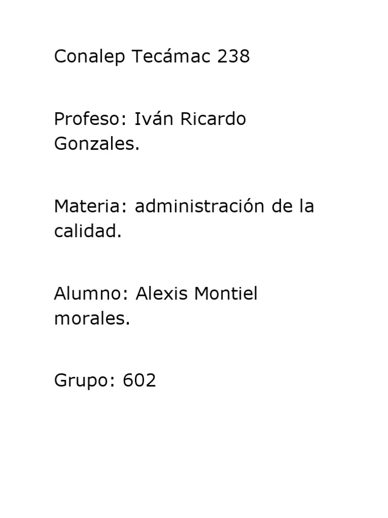 Conalep Tecmac 238 Profeso: Ivn Ricardo Gonzales. Materia: administracin de la calidad. Alumno: Alexis Montiel morales.