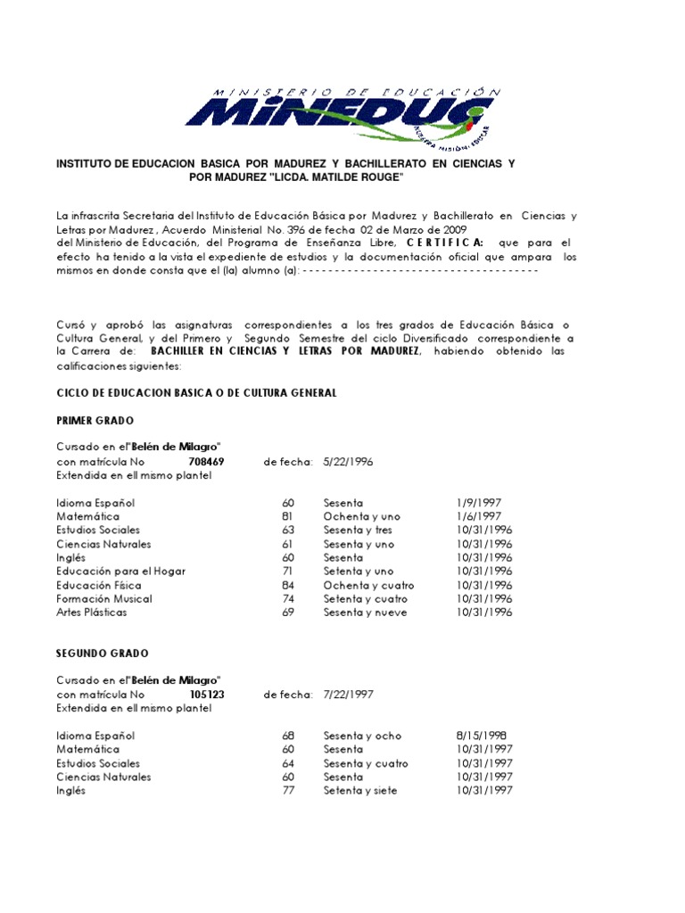 La infrascrita Secretaria del Instituto de Educacin Bsica por Madurez y Bachillerato en Ciencias y Letras por Madurez "Licda. Matilde Rouge", Acuerdo Ministerial No. 396 de fecha 02 de Marzo de 2009 del Ministerio de Educacin, del Programa de Enseanza LIBRE, C E R T I F I C A: que para el efecto ha tenido a la vista el expediente de estudios y la documentacin oficial que ampara los mismos en donde consta que el (la) alumno (a): - - - - - - - - - - - - - - - - - - - - - - - - - - - - - - - - - - - - -