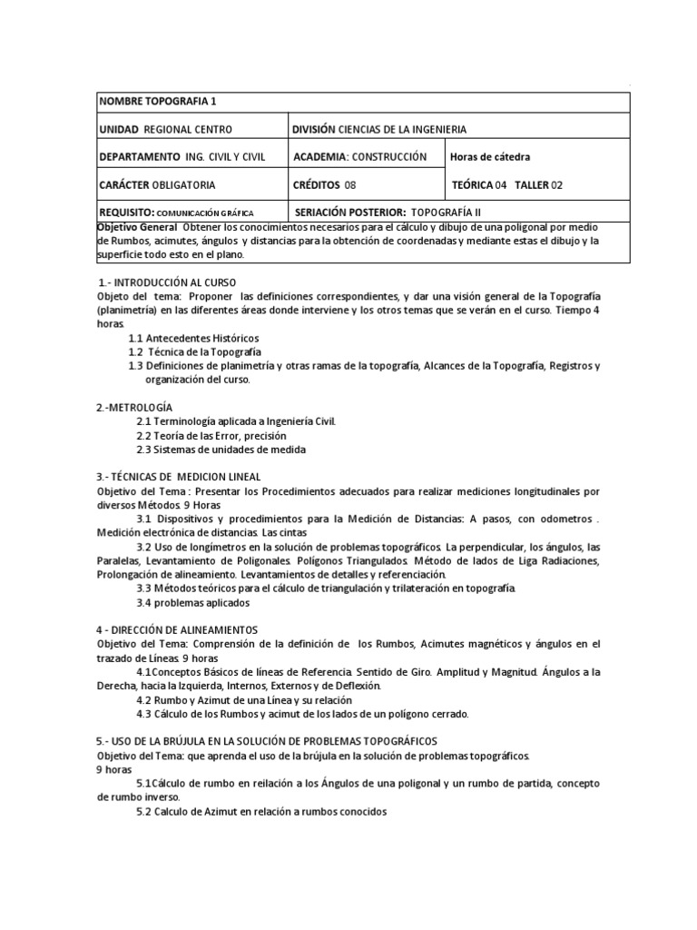 REQUISITO: COMUNICACIN GRFICA SERIACIN POSTERIOR: TOPOGRAFA II Objetivo General Obtener los conocimientos necesarios para el clculo y dibujo de una poligonal por medio de Rumbos, acimutes, ngulos y distancias para la obtencin de coordenadas y mediante estas el dibujo y la superficie todo esto en el plano. 1.- INTRODUCCIN AL CURSO Objeto del tema: Proponer las definiciones correspondientes, y dar una visin general de la Topografa (planimetra) en las diferentes reas donde interviene y los otros temas que se vern en el curso. Tiempo 4 horas. 1.1 Antecedentes Histricos 1.2 Tcnica de la Topografa 1.3 Definiciones de planimetra y otras ramas de la topografa, Alcances de la Topografa, Registros y organizacin del curso. 2.-METROLOGA 2.1 Terminologa aplicada a Ingeniera Civil. 2.2 Teora de las Error, precisin 2.3 Sistemas de unidades de medida 3.- TCNICAS DE MEDICION LINEAL Objetivo del Tema : Presentar los Procedimientos adecuados para realizar mediciones longitudinales por diversos Mtodos. 9 Horas 3.1 Dispositivos y procedimientos para la Medicin de Distancias: A pasos, con odometros . Medicin electrnica de distancias. Las cintas 3.2 Uso de longmetros en la solucin de problemas topogrficos. La perpendicular, los ngulos, las Paralelas, Levantamiento de Poligonales. Polgonos Triangulados. Mtodo de lados de Liga Radiaciones, Prolongacin de alineamiento. Levantamientos de detalles y referenciacin. 3.3 Mtodos tericos para el clculo de triangulacin y trilateracin en topografa. 3.4 problemas aplicados 4 - DIRECCIN DE ALINEAMIENTOS Objetivo del Tema: Comprensin de la definicin de los Rumbos, Acimutes magnticos y ngulos en el trazado de Lneas. 9 horas 4.1Conceptos Bsicos de lneas de Referencia. Sentido de Giro. Amplitud y Magnitud. ngulos a la Derecha, hacia la Izquierda, Internos, Externos y de Deflexin. 4.2 Rumbo y Azimut de una Lnea y su relacin 4.3 Clculo de los Rumbos y acimut de los lados de un polgono cerrado. 5.- USO DE LA BRJULA EN LA SOLUCIN DE PROBLEMAS TOPOGRFICOS Objetivo del Tema: que aprenda el uso de la brjula en la solucin de problemas topogrficos. 9 horas 5.1Clculo de rumbo en reilacin a los ngulos de una poligonal y un rumbo de partida, concepto de rumbo inverso. 5.2 Calculo de Azimut en relacin a rumbos conocidos
