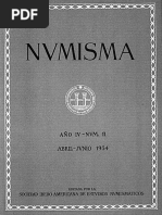 IJemos de citar, ante todo, la CronicaCatalogo de la 1 Exposicicin Nacional de S u mismtica (Ediciones Municipales, Tarrasa, 10,51), que comprende no slo una circunstanciada crnica y memoria de las actividades de la citada Exposicin, celebrada en julio de 1949, sino tambin resea de las aportaciones de cada expositor y, en algn caso, la comunicacin completa ; la importancia del libro radica en que sirve de perpetuacin escrita de la 1 Exposicin Nacional, sirviendo de laudable modelo a todas las manifestaciones anlogas, que sin publicacin pronto caen en el olvido. Otras publicaciones de 1951, con extensas secciones de Numismtica, han sido la barcelonesa Ampurias (nm. XIII), editada por el Museo Arqueolgico; la Crnica del Y1 Congreso Arqueolgico del Sudeste Espaol (edicin del Seminario de Numismtica Aragonesa, de Zaragoza, Cartagena, 1933), y las revistas y boletines especializados que citaremos. L a American Numismafie Society, de Nue-
