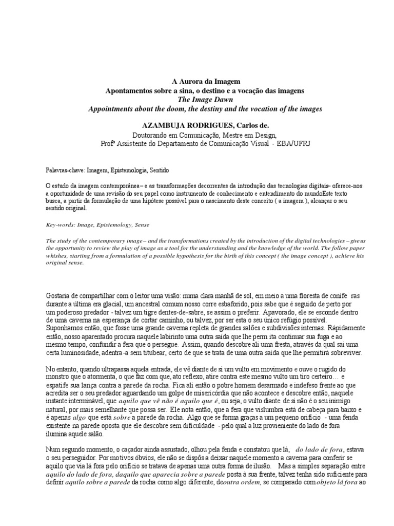 Palavras-chave: Imagem, Epistemologia, Sentido O estudo da imagem contempornea e as transformaes decorrentes da introduo das tecnologias digitais oferece-nos a oportunidade de uma reviso do seu papel como instrumento de conhecimento e entendimento do mundo. Este texto busca, a partir da formulao de uma hiptese possvel para o nascimento deste conceito ( a imagem ), alcanar o seu sentido original. Key-words: Image, Epistemology, Sense The study of the contemporary image and the transformations created by the introduction of the digital technologies give us the opportunity to review the play of image as a tool for the understanding and the knowledge of the world. The follow paper whishes, starting from a formulation of a possible hypothesis for the birth of this concept ( the image concept ), achieve his original sense.