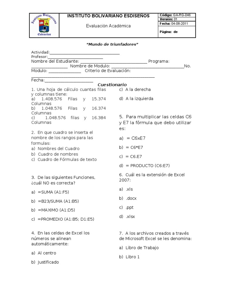 Nombre del Estudiante: _________________________________ Programa: __________________ Nombre de Modulo: ____________________________________No. Modulo: ________________ Criterio de Evaluacin: _____________________________________________________________ Fecha:________________________ Cuestionario 1. Una hoja de clculo cuantas filas c) A la derecha y columnas tiene: d) A la izquierda a) 1.408.576 Filas y 15.374 Columnas b) 1.048.576 Filas y 16.374 Columnas 5. Para multiplicar las celdas C6 c) 1.048.576 filas y 16.384 Columnas y E7 la frmula que debo utilizar 2. En que cuadro se inserta el nombre de los rangos para las formulas: a) Nombres del Cuadro b) Cuadro de nombres c) Cuadro de Frmulas de texto