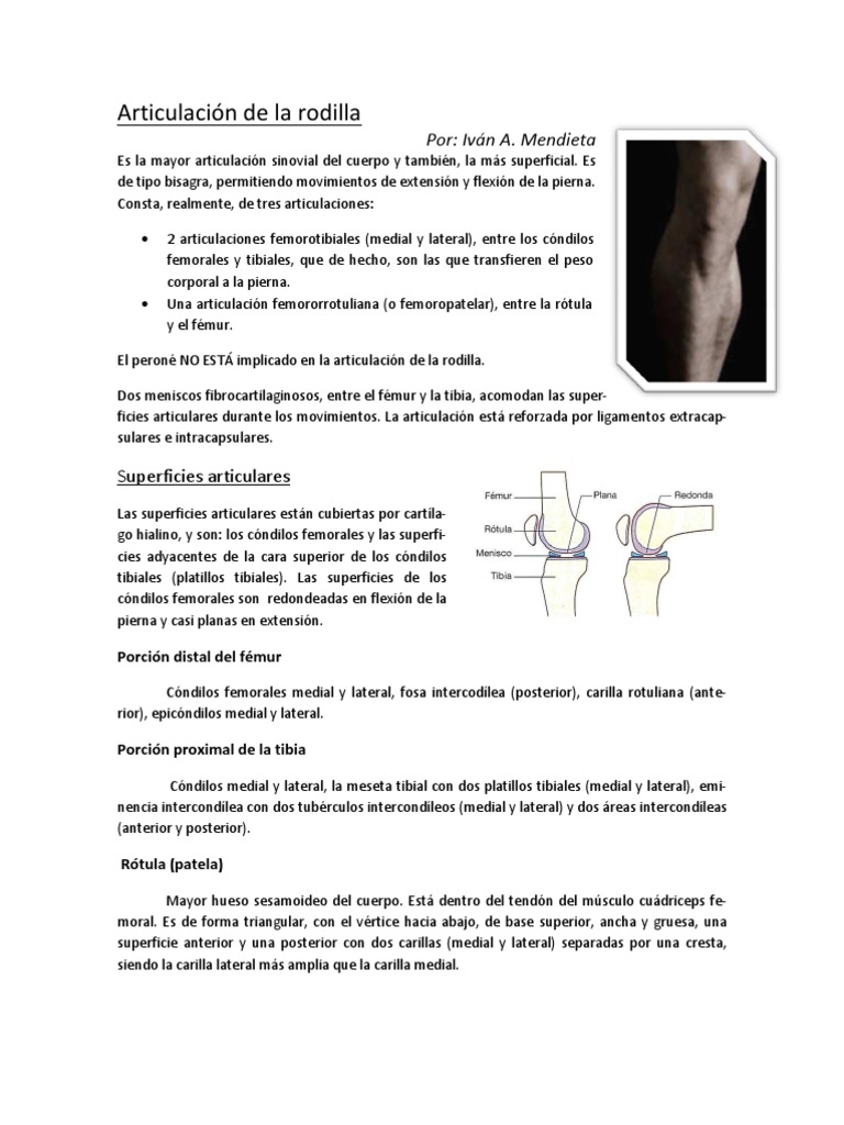 Es la mayor articulacin sinovial del cuerpo y tambin, la ms superficial. Es de tipo bisagra, permitiendo movimientos de extensin y flexin de la pierna. Consta, realmente, de tres articulaciones: 2 articulaciones femorotibiales (medial y lateral), entre los cndilos femorales y tibiales, que de hecho, son las que transfieren el peso corporal a la pierna. Una articulacin femororrotuliana (o femoropatelar), entre la rtula y el fmur.