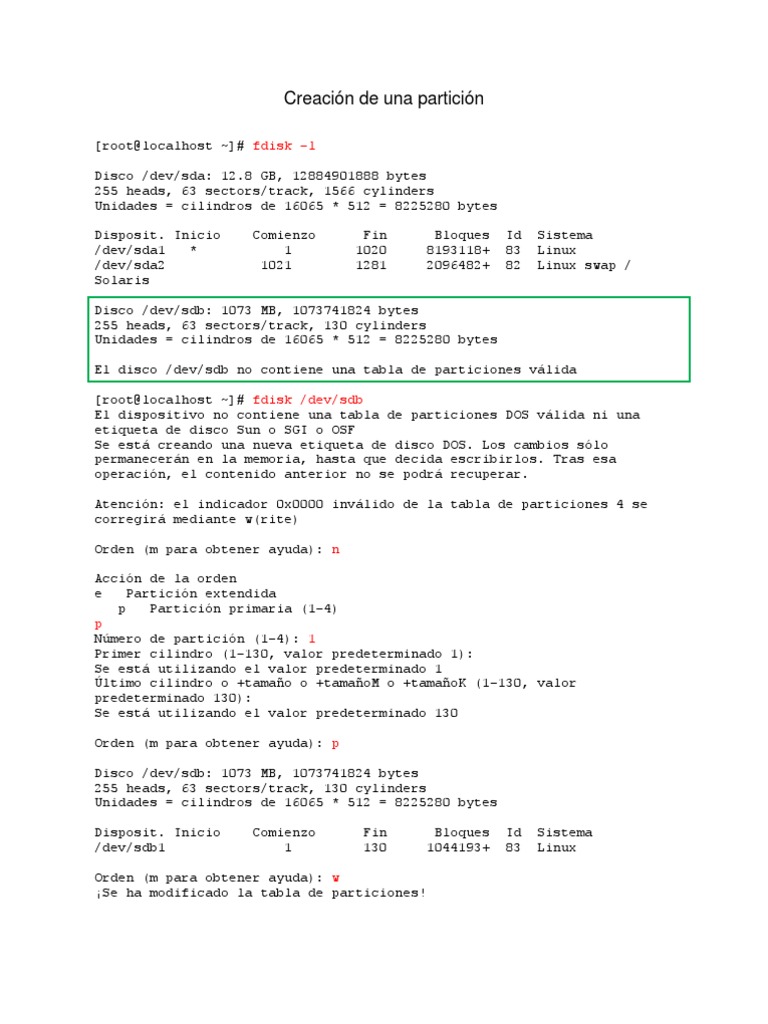 Llamando a ioctl() para volver a leer la tabla de particiones. Se estn sincronizando los discos. [root@localhost ~]# [root@localhost ~]# fdisk -l Disco /dev/sda: 12.8 GB, 12884901888 bytes 255 heads, 63 sectors/track, 1566 cylinders Unidades = cilindros de 16065 * 512 = 8225280 bytes Disposit. Inicio /dev/sda1 * /dev/sda2 Solaris Comienzo 1 1021 Fin 1020 1281 Bloques 8193118+ 2096482+ Id 83 82 Sistema Linux Linux swap /