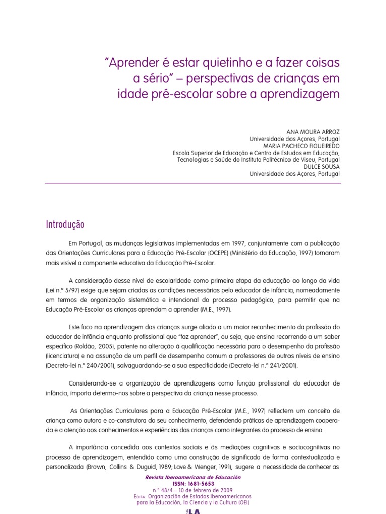 Em Portugal, as mudanas legislativas implementadas em 1997, conjuntamente com a publicao das Orientaes Curriculares para a Educao Pr-Escolar (OCEPE) (Ministrio da Educao, 1997) tornaram mais visvel a componente educativa da Educao Pr-Escolar. A considerao desse nvel de escolaridade como primeira etapa da educao ao longo da vida (Lei n. 5/97) exige que sejam criadas as condies necessrias pelo educador de infncia, nomeadamente em termos de organizao sistemtica e intencional do processo pedaggico, para permitir que na Educao Pr-Escolar as crianas aprendam a aprender (M.E., 1997). Este foco na aprendizagem das crianas surge aliado a um maior reconhecimento da profisso do educador de infncia enquanto profissional que faz aprender, ou seja, que ensina recorrendo a um saber especfico (Roldo, 2005), patente na alterao qualificao necessria para o desempenho da profisso (licenciatura) e na assuno de um perfil de desempenho comum a professores de outros nveis de ensino (Decreto-lei n. 240/2001), salvaguardando-se a sua especificidade (Decreto-lei n. 241/2001). Considerando-se a organizao de aprendizagens como funo profissional do educador de infncia, importa determo-nos sobre a perspectiva da criana nesse processo. As Orientaes Curriculares para a Educao Pr-Escolar (M.E., 1997) reflectem um conceito de criana como autora e co-construtora do seu conhecimento, defendendo prticas de aprendizagem cooperada e a ateno aos conhecimentos e experincias das crianas como integrantes do processo de ensino. A importncia concedida aos contextos sociais e s mediaes cognitivas e sociocognitivas no processo de aprendizagem, entendido como uma construo de significado de forma contextualizada e personalizada (Brown, Collins & Duguid, 1989; Lave & Wenger, 1991), sugere a necessidade de conhecer as