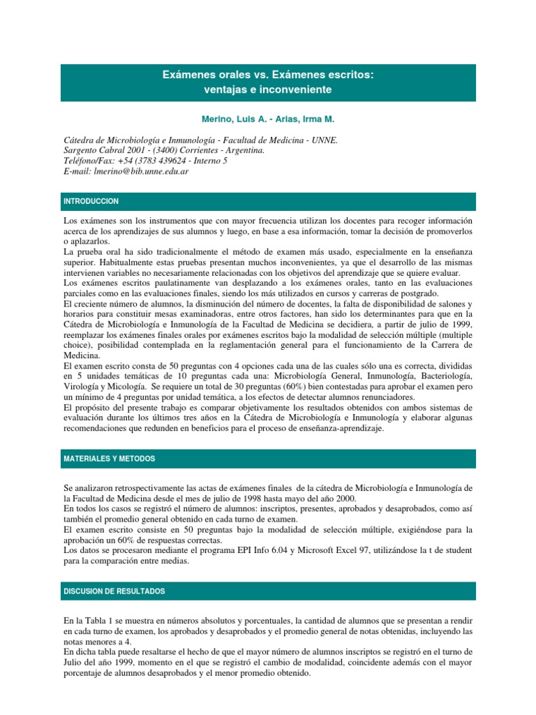Ambos tipos de exmenes presentan sus ventajas e inconvenientes, y cada cuerpo docente debera adoptar aquel que mejor se adapte a las circunstancias, siempre que la prueba aplicada sirva realmente para evaluar el aprendizaje de los alumnos de acuerdo con los objetivos planteados. Debido a que en la formulacin del cuestionario escrito se han utilizado los mismos criterios para examinar a los alumnos en forma oral, se puede concluir, dejando de lado las diferencias operativas entre ambas modalidades que la evaluacin escrito no altera significativamente el nmero de alumnos desaprobados pero s definen un marcado descenso en el promedio de notas obtenidas con respecto al examen oral, situacin que podra ser subsanada si se considerara suficiente para aprobar el examen escrito un 40% de respuestas correctas.