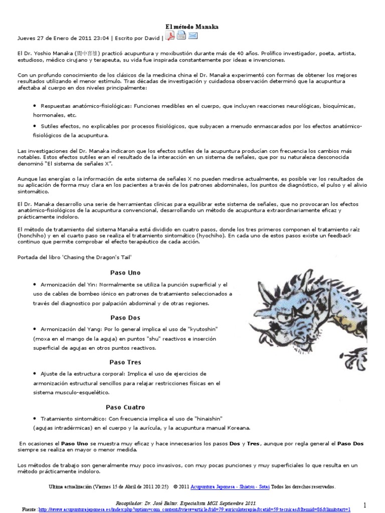 Jueves 27 de Enero de 2011 23:04 | Escrito por David | El Dr. Yoshio Manaka () practic acupuntura y moxibustin durante ms de 40 aos. Prolfico investigador, poeta, artista, estudioso, mdico cirujano y terapeuta, su vida fue inspirada constantemente por ideas e invenciones. Con un profundo conocimiento de los clsicos de la medicina china el Dr. Manaka experiment con formas de obtener los mejores resultados utilizando el menor estmulo. Tras dcadas de investigacin y cuidadosa observacin determin que la acupuntura afectaba al cuerpo en dos niveles principalmente: