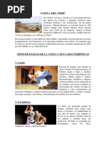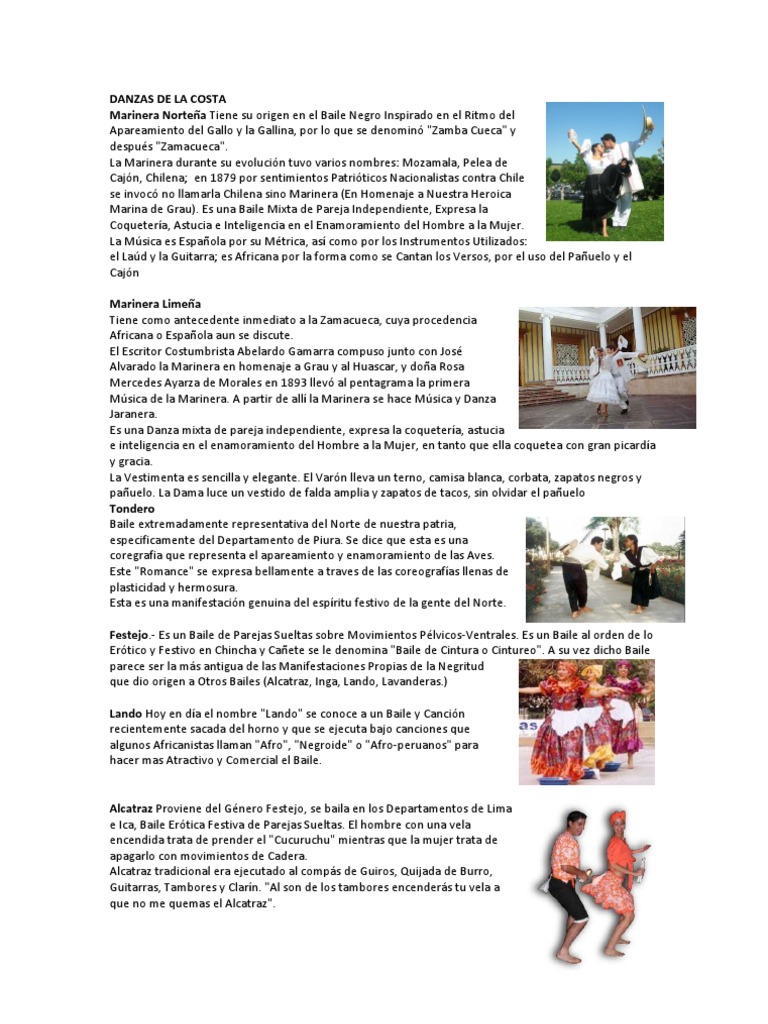 por lo que se denomin "Zamba Cueca" y despus "Zamacueca". La Marinera durante su evolucin tuvo varios nombres: Mozamala, Pelea de Cajn, Chilena; en 1879 por sentimientos Patriticos Nacionalistas contra Chile se invoc no llamarla Chilena sino Marinera (En Homenaje a Nuestra Heroica Marina de Grau). Es una Baile Mixta de Pareja Independiente, Expresa la Coquetera, Astucia e Inteligencia en el Enamoramiento del Hombre a la Mujer. La Msica es Espaola por su Mtrica, as como por los Instrumentos Utilizados: el Lad y la Guitarra; es Africana por la forma como se Cantan los Versos, por el uso del Pauelo y el Cajn Marinera Limea Tiene como antecedente inmediato a la Zamacueca, cuya procedencia Africana o Espaola aun se discute. El Escritor Costumbrista Abelardo Gamarra compuso junto con Jos Alvarado la Marinera en homenaje a Grau y al Huascar, y doa Rosa Mercedes Ayarza de Morales en 1893 llev al pentagrama la primera Msica de la Marinera. A partir de all la Marinera se hace Msica y Danza Jaranera. Es una Danza mixta de pareja independiente, expresa la coquetera, astucia e inteligencia en el enamoramiento del Hombre a la Mujer, en tanto que ella coquetea con gran picarda y gracia. La Vestimenta es sencilla y elegante. El Varn lleva un terno, camisa blanca, corbata, zapatos negros y pauelo. La Dama luce un vestido de falda amplia y zapatos de tacos, sin olvidar el pauelo Tondero Baile extremadamente representativa del Norte de nuestra patria, especificamente del Departamento de Piura. Se dice que esta es una coregrafia que representa el apareamiento y enamoramiento de las Aves. Este "Romance" se expresa bellamente a traves de las coreografas llenas de plasticidad y hermosura. Esta es una manifestacin genuina del espritu festivo de la gente del Norte. Festejo.- Es un Baile de Parejas Sueltas sobre Movimientos Plvicos-Ventrales. Es un Baile al orden de lo Ertico y Festivo en Chincha y Caete se le denomina "Baile de Cintura o Cintureo". A su vez dicho Baile parece ser la ms antigua de las Manifestaciones Propias de la Negritud que dio origen a Otros Bailes (Alcatraz, Inga, Lando, Lavanderas.) Lando Hoy en da el nombre "Lando" se conoce a un Baile y Cancin recientemente sacada del horno y que se ejecuta bajo canciones que algunos Africanistas llaman "Afro", "Negroide" o "Afro-peruanos" para hacer mas Atractivo y Comercial el Baile.