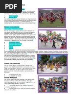 DANZAS DE LA SIERRA 1-Danza de las Tijeras .-Comenz en Huamanga, despus de 1565 como supervivencia del "TAKY ONQOY" Danza del Sufrimiento surgido como primera respuesta a la Invasin Espaola. es un Danza de Resistencia Cultural que rinde tributo al Dios Andino Apu Kontikse, Wiracocha, Pachayachachi, donde el Danzante anuncia el retorno de Inkarri e interpreta la cada del Imperio Incaico y la posterior Dominacin Espaola 2-Sara Hallmay.-Es una Danza que se ejecuta en el distrito de Tinta, provincia de Canchis, Departamento del Cusco. Se ejecuta en el tiempo del Pukllay o Carnavales. Sara Hallmay significa aporca r el maiz y esto es lo que se describe en la ejecucin de esta Danza. Sara Hallmay es ejecutado en su mayora por varones, participando solamente dos mujeres que representan a las propietarias del terreno y se encargan de la bebida y la comida de los agricultores. Los Instrumentos utilizados para esta escenificacin son la Bandurria Andina, que en algunos casos llega a tener hasta 20 cuerdas y la Quena que complementa al primero. 3-Huaylash Antiguo.-Zona Sur del Valle del Mantaro, proviene del vocablo Quechua que significa "Festividad", nuestros ancestros, la Cultura Wanca rendan Pleitesa a la tierra (Mama Pacha) como agradecimiento por los Frutos que esta le brindaba para su supervivencia. Es una Manifestacin de Alegra donde el varn (Hualarsh) demuestra su Virilidad, Fuerza y Vigor tratando de enamorar a la mujer (Huambla).