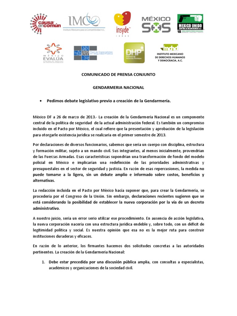 -como la Policía Federal- para que cuente con un basamento jurídico sólido y con la legitimidad que otorga la aprobación del Congreso de la Unión. Las organizaciones y personas firmantes tenemos opiniones diversas sobre la utilidad y conveniencia de crear una corporación con las características de la Gendarmería. Sin embargo, compartimos una convicción: no es deseable crearla por decreto, sin debate, sin una reflexión seria sobre sus implicaciones. Pedimos una discusión, no la cancelación del proyecto. Estamos seguros de que las autoridades y nuestros representantes habrán de dar respuesta positiva a nuestra solicitud. Atentamente