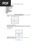 INTRODUCCIN Al comenzar los estudios del Clculo se suele trabajar de forma especial con coordenadas planas o coordenadas cartesianas, dejando de lado las coordenadas polares. Sin embargo, conforme se contina avanzando en el estudio del Clculo, nos damos cuenta de la necesidad de utilizar coordenadas polares para realizar ciertos clculos y procedimientos que no podran realizarse exitosamente con coordenadas cartesianas. No se trata de que un sistema de coordenadas sea mejor que el otro, sino que ambos son importantes pero uno servir algunas veces y el otro servir en otras ocasiones, dependiendo de nuestras necesidades y del trabajo que estemos realizando. En este trabajo investigativo se presenta una buena cantidad de grficos que nos permitirn conocer muchas de las figuras o grficos que se forman usualmente a travs de funciones en coordenadas polares. Cada uno de ellos tiene una breve explicacin que consiste en describir el grfico que resulta de la funcin y tambin se dan algunos breves detalles histricos o caractersticas que nos permiten reconocer determinado grfico. Para hacernos una idea general de los grficos que se presentarn durante las pginas que veremos seguidamente, vemos ahora un listado general de los tipos de funciones que son graficados en este reporte o las figuras que resultarn: 1. Rosa 2. Cardioide 3. Limaon o caracol 4. Circunferencia 5. Lemniscata 6. Nefroide de Freeth 7. Concoide de Nicmenes 8. Cisoide de Diocles 9. Parbola