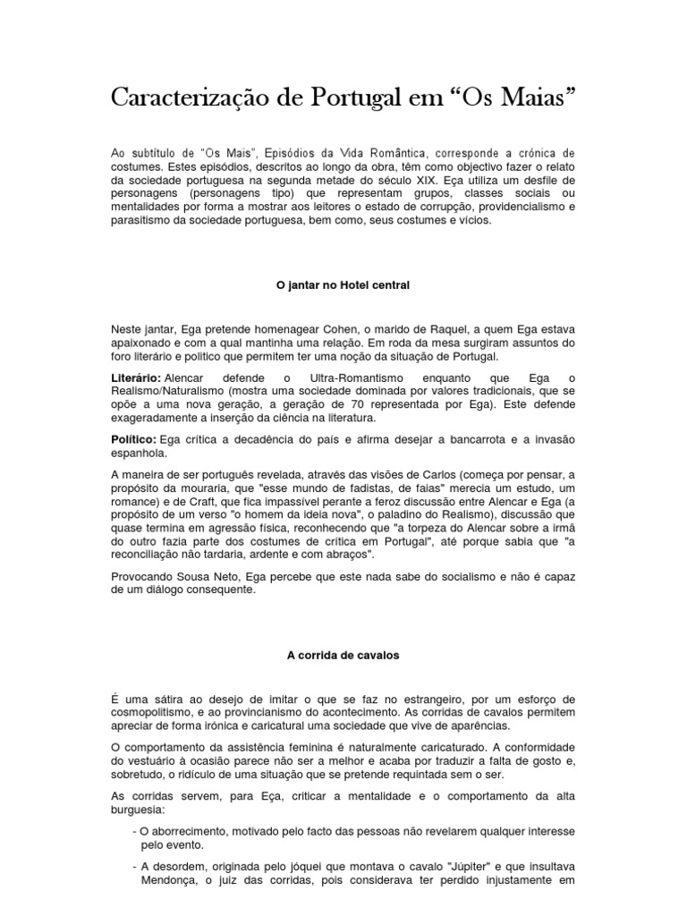 pele do africano. Contra a vontade de Afonso, Pedro da Maia apaixona-se e casa com ela. Nasceram Carlos e M Eduarda. M Monforte vir a fugir com o italiano Tancredo, levando M Eduarda consigo e abandonando Carlos e provocando o suicdio de Pedro. Entretanto, o italiano morto num duelo e M levar uma vida dissoluta. Entregar a Guimares um cofre com documentos p/ a identificao da filha. Alencar: Personagem-tipo, o smbolo do romantismo. Representa a incapacidade de adaptao ideia nova (realismo), tornando-se paladino da Moral e gendarme dos Bons Costumes. Dmaso Salcede: representa a podrido das sociedades, o rafeiro de Carlos, anda sempre atrs dele e imita-o em tudo. Costuma ser considerado o representante do novo riquismo e a smula dos vcios e futilidades da Lisboa dos fins do sec.XIX. Conde de Gouvarinho: ministro, e representa o poder poltico incompetente. Condessa de Gouvarinho e Raquel Cohen: mulheres adulteras, sem princpios morais. Sousa Neto: Oficial superior do ministrio da instruo publica, representa a mediocridade intelectual, d o espelho da administrao portuguesa. Palma cavalo: Director do jornal A corneta do diabo, representa o jornalismo corrupto, sensacionalista e escandaloso que vive da calnia e do suborno. Craft: inglese, representa a formao e mentalidade britnicas, sendo Craft o jovem mais parecido com Carlos Jacob Cohen: judeu banqueiro, representante da alta finana, poder econmico. Steinbroken: bom bartono, ministro da Finlndia, insuportavelmente maador e inoperante pk representa uma diplomacia intil nuns pais como Portugal. Eusebiozinho: representa a educao tradicionalmente portuguesa, romntica, uma educao sem valores morais. Guimares: personificao do destino.