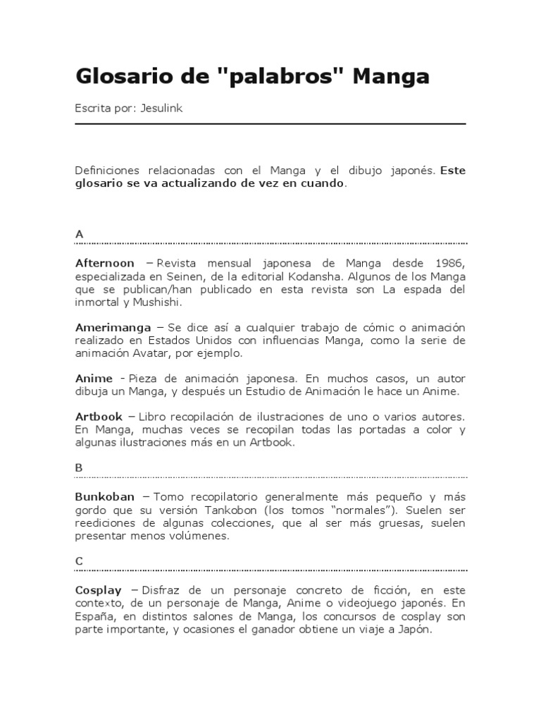 A Afternoon Revista mensual japonesa de Manga desde 1986, especializada en Seinen, de la editorial Kodansha. Algunos de los Manga que se publican/han publicado en esta revista son La espada del inmortal y Mushishi. Amerimanga Se dice as a cualquier trabajo de cmic o animacin realizado en Estados Unidos con influencias Manga, como la serie de animacin Avatar, por ejemplo. Anime - Pieza de animacin japonesa. En muchos casos, un autor dibuja un Manga, y despus un Estudio de Animacin le hace un Anime. Artbook Libro recopilacin de ilustraciones de uno o varios autores. En Manga, muchas veces se recopilan todas las portadas a color y algunas ilustraciones ms en un Artbook. B Bunkoban Tomo recopilatorio generalmente ms pequeo y ms gordo que su versin Tankobon (los tomos normales). Suelen ser reediciones de algunas colecciones, que al ser ms gruesas, suelen presentar menos volmenes. C Cosplay Disfraz de un personaje concreto de ficcin, en este contexto, de un personaje de Manga, Anime o videojuego japons. En Espaa, en distintos salones de Manga, los concursos de cosplay son parte importante, y ocasiones el ganador obtiene un viaje a Japn.