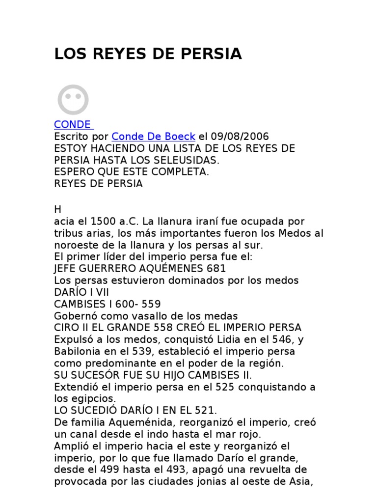 CONDE Escrito por Conde De Boeck el 09/08/2006 ESTOY HACIENDO UNA LISTA DE LOS REYES DE PERSIA HASTA LOS SELEUSIDAS. ESPERO QUE ESTE COMPLETA. REYES DE PERSIA H acia el 1500 a.C. La llanura iran fue ocupada por tribus arias, los ms importantes fueron los Medos al noroeste de la llanura y los persas al sur. El primer lder del imperio persa fue el: JEFE GUERRERO AQUMENES 681 Los persas estuvieron dominados por los medos DARO I VII CAMBISES I 600- 559 Gobern como vasallo de los medas CIRO II EL GRANDE 558 CRE EL IMPERIO PERSA Expuls a los medos, conquist Lidia en el 546, y Babilonia en el 539, estableci el imperio persa como predominante en el poder de la regin. SU SUCESR FUE SU HIJO CAMBISES II. Extendi el imperio persa en el 525 conquistando a los egipcios. LO SUCEDI DARO I EN EL 521. De familia Aquemnida, reorganiz el imperio, cre un canal desde el indo hasta el mar rojo. Ampli el imperio hacia el este y reorganiz el imperio, por lo que fue llamado Daro el grande, desde el 499 hasta el 493, apag una revuelta de provocada por las ciudades jonias al oeste de Asia,